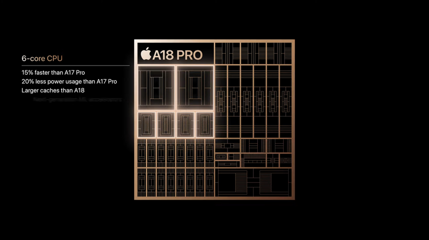 Apple сообщает, что процессор Apple A18 Pro был создан с учетом потребностей моделей iPhone «Pro». Как и ожидалось, он оборудован 6-ядерным графическим процессором, в то время как структура центрального процессора осталась прежней. Компания утверждает, что A18 Pro на 15% эффективнее, чем его предшественник A17 Pro, при этом обеспечивая на 20% меньший расход энергии. Среди других примечательных функций — наличие специализированного медиа-движка, повышенные скорости передачи данных через USB и возможность записи в формате ProRes.