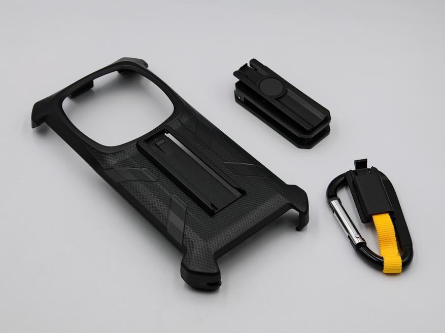 Помимо этого всего производитель еще положил защитный чехол с двумя крепежами. Комплект поставки можно смело назвать богатым. Есть, как необходимые аксессуары, так и дополнительные вещи, которые могут быть нужны не всем и не всегда. Защитный чехол для и так защищенного смартфона — звучит странновато) А вот карабин для крепления на рюкзак например и прищепка для фиксации — уже становится понятно для чего этот дополнительный аксессуар нужен.