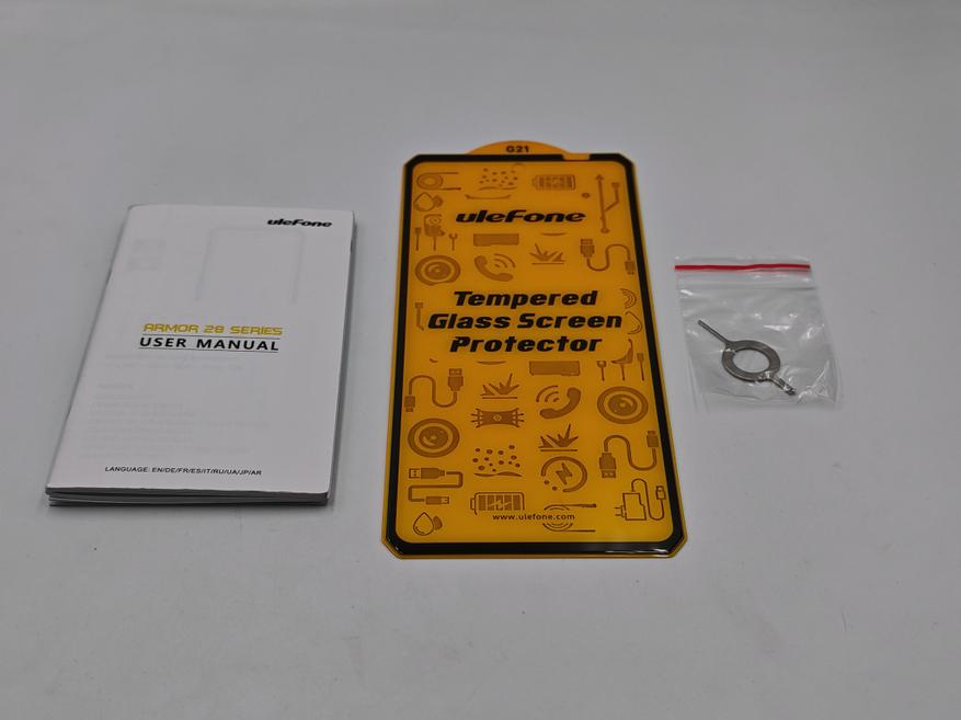 Внутри также находится бумажная документация — краткая инструкция, гарантийный талон, и стандартный инструмент для извлечения SIM-лотка, который, как и сам корпус, защищён герметичной крышкой. Не забыли и про защитное стекло и даже ремешок для крепления смартфона на запястье — полезная деталь для активных пользователей, туристов и сотрудников полевых служб.