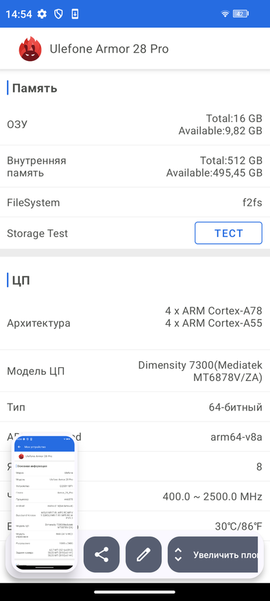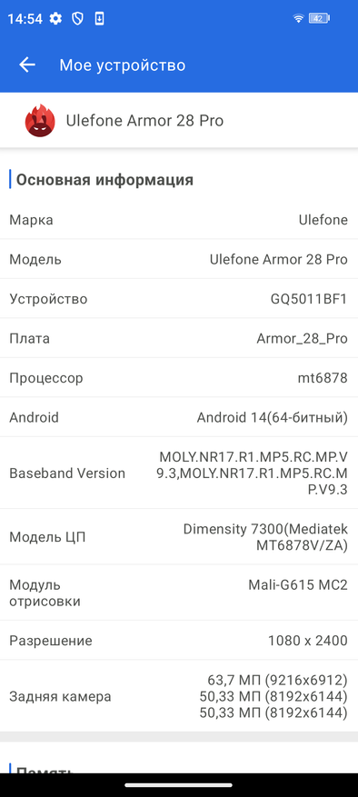 Внутри Armor 28 Pro установлен восьмиядерный чип MediaTek Dimensity 7300, произведённый по 4-нм техпроцессу. Это современный и энергоэффективный процессор с хорошим балансом мощности и автономности. Он обеспечивает быструю работу интерфейса, стабильность в играх и комфорт при съёмке фото/видео высокого разрешения.