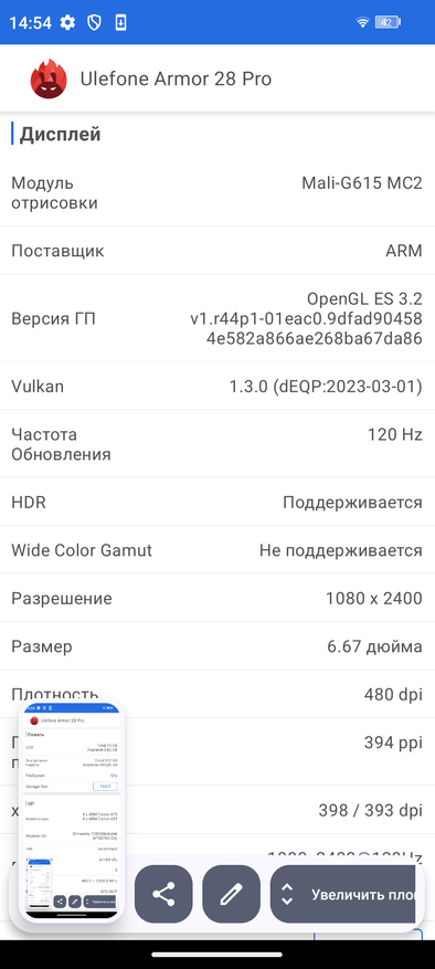 Главный AMOLED-дисплей Ulefone Armor 28 Pro — это крупная 6.67-дюймовая панель с разрешением Full HD+ и частотой обновления 120 Гц. Картинка плавная, отклик быстрый, интерфейс Android ощущается «живым». Но главное — яркость: до 2200 нит. Это один из самых ярких экранов в защищённых смартфонах, и он остаётся читаемым даже под прямым солнцем — будь то стройплощадка, пляж или снежные вершины.