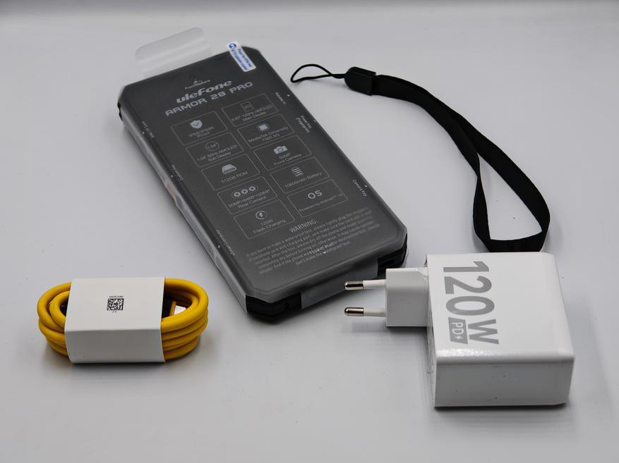 Комплект поставки Ulefone Armor 28 Pro вполне соответствует духу самого смартфона: всё строго, практично и по делу. В коробке вас встречает сам аппарат — массивный, уже с наклеенной защитной плёнкой на экране. Помимо него, производитель кладёт мощный блок быстрой зарядки на 120 ватт, благодаря которому батарею ёмкостью 10 600 мАч можно зарядить полностью чуть более, чем за час. Кабель USB-C — фирменный, усиленный, с плотной оплёткой, рассчитан на активное использование в условиях нештатной эксплуатации.
