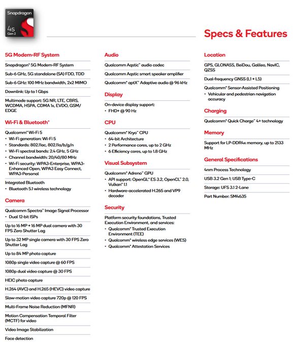 Snapdragon 4s Gen 2 поддерживает Bluetooth 5.1 и Wi-Fi 5, а также оснащен высокопроизводительным процессором Kryo с двумя производительными ядрами с частотой 2 ГГц и шестью эффективными ядрами с частотой 1,8 ГГц.