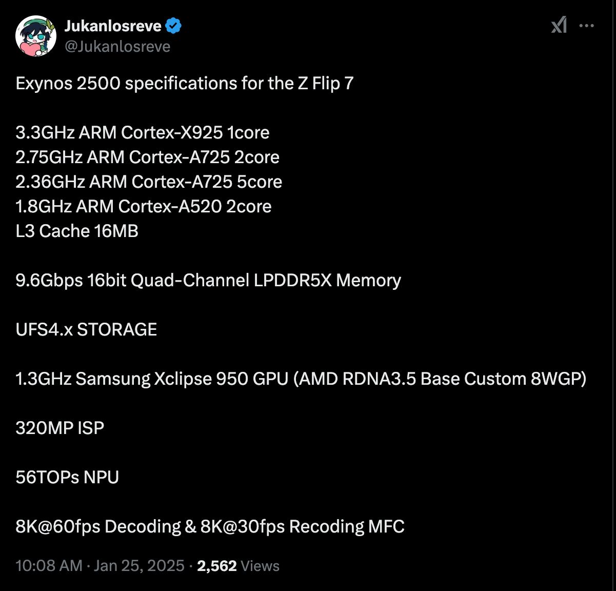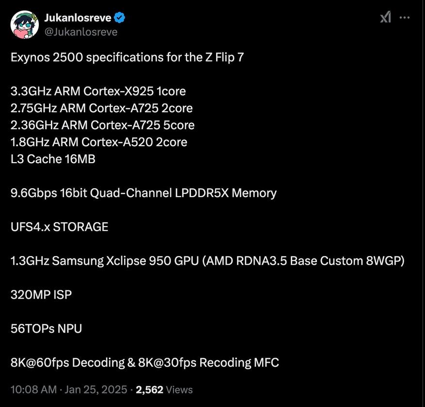 Появилась информация о том, что новейший чип Samsung Exynos 2500 дебютирует в складном смартфоне Galaxy Z Flip7. Информацией поделился источник @Jukanlosreve на платформе X.