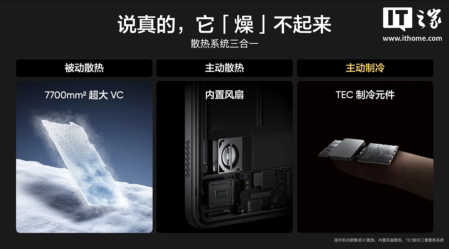 Система охлаждения включает пассивный элемент в виде испарительной камеры площадью 7700 квадратных миллиметров, активный охлаждающий вентилятор для ускоренного отвода тепла и твердотельный охлаждающий элемент TEC для прямого снижения температуры внутренних компонентов. Производитель заявляет о возможности снижения температуры устройства на шесть градусов Цельсия при активации системы одним нажатием.