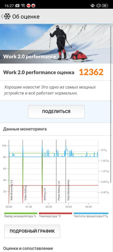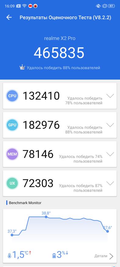 «Сердцем» Realme X2 Pro является топовый восьмиядерный чип Qualcomm Snapdragon 855+, выполненным по 7-нанометровой технологии (1 ядро Kryo 485 Gold 2,96 ГГц + 3 ядра Kryo 485 Gold 2,42 ГГц + 4 ядра Kryo 485 Silver 1,8 ГГц). Графический ускоритель Adreno 640 работает со всеми современными версиями графического API. В продаже есть модели с конфигурацией 8/128 ГБ и 12/256 ГБ, причем память тут не абы какая, а самая быстрая – UFS 3.0. Чтобы от осознания всей это мощи, телефон не задымился, используется жидкостное охлаждение, которое не дает подняться температуре выше 36 градусов, и, судя по тестам, троттлинг не превышает 15%. Все современные игры (PUBG, Real Racing 3, Shadowgun Legends, Injustice 2 и многие другие) плавно работают на максимальных настройках графики, а бенчмарки выдают рекордных «попугаев».