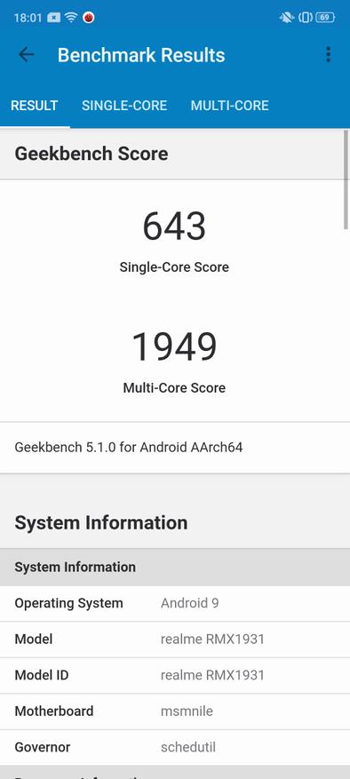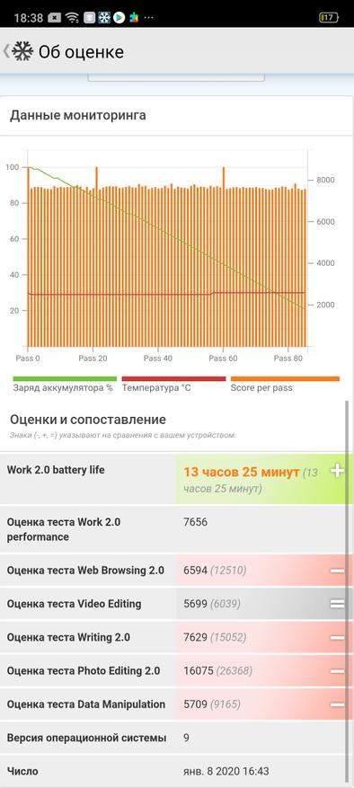 Производительное «железо» и большой экран берут свое – рекордов в плане автономности смартфон не ставит. Его батарея на 4000 мАч разряжается в тесте со 100% до 20% за 13 ч 25 мин. В режиме чтения это 19 часов, наслаждаться видео можно около 15 часов, а вот производительные игры «высадят» весь заряд всего за 6 ч. В итоге, аккумулятора Realme хватает более, чем на сутки усердной эксплуатации, что является среднем значением показателя.