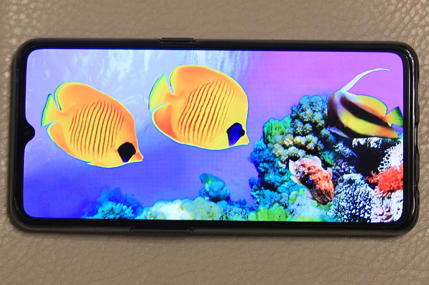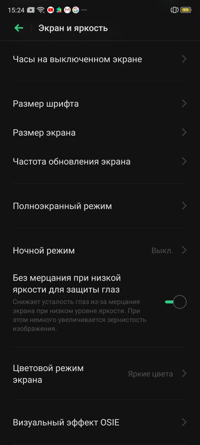 91,7% фронтальной поверхности занимает огромный 6,5-дюймовый экран с AMOLED-матрицей и частотой обновления 90 Гц. Последняя «фишка» позволяет отображать всю анимацию более плавно, но взамен «требует» большего расхода батареи. Разрешение составляет 2400x1080. Дисплей обеспечивает широкие углы обзора и бесконечную контрастность. Между слоями отсутствует воздушная прослойка, что уменьшает блики, а цвета выглядят сочными и яркими, но если, вдруг, кому-то по душе более нежные оттенки, то тут есть регулировка цветовой температуры и насыщенности цветов. Охват соответствует sRGB для пресета «нежные цвета» и заметно шире его в «ярких цветах». Экран поддерживает технологию отображения HDR10+. Диапазон яркости от 2,3 до 520 кд/м2, а это значит, что с гаджетом будет комфортно работать как ночью, так и на ярком солнце, есть регулировка по датчику освещенности. Благодаря опции «Без мерцания при низкой яркости», глаза будут уставать заметно меньше.