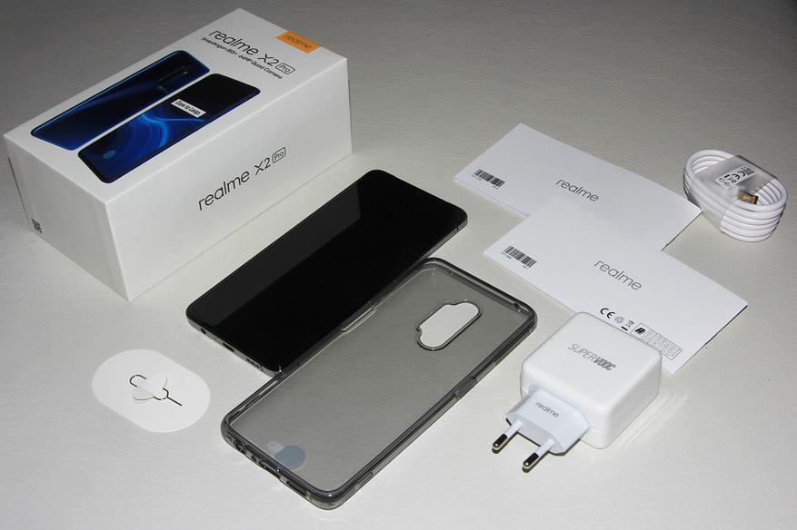 Внутри белоснежной коробки есть практически все, что нужно для счастья: смартфон Realme X2 Pro, силиконовый чехол к нему, наклеенная на экран пленка, кабель USB Type-C, зарядное устройство SuperVOOC на 50 Вт, SIM-скрепка и инструкция. В продаже можно найти смартфон в расцветках Lunar White и Neptune Blue