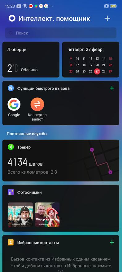 Сюда встроен «Игровой режим», который не только повышает производительность, но и защищает от перегрева, позволяет принимать звонки, не выходя из игры, может блокировать изменение яркости, динамично изменять разрешение приложения для экономии заряда батареи и ограничивать доступ к сети другим потребителям, чтобы не загружали канал. Собственный интеллектуальный помощник определит количество пройденных шагов, выведет на отдельный экран избранный контакт, последний альбом с фотографиями или подскажет прогноз погоды. Впрочем, он не мешает работать и Google Assistant, который вызывается удержанием кнопки включения.