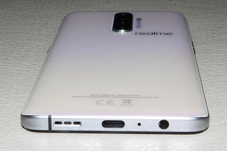 На лицевой панели можно отметить минимальные рамки (3,5 мм с трех сторон и 5 мм снизу), каплевидный вырез под фронталку и широкий (42 мм) разговорный динамик. Послушавшись голоса разума, дизайнеры Realme расположили «по разные стороны баррикад» кнопку блокировки (справа) и качель громкости (слева). Слот для карт обнаруживается на правом торце, но, неожиданно, без microSD (только две nanoSIM). Конечно, я понимаю, что 256 ГБ «забить» довольно сложно, но раз уж хотите народный смартфон делать, то будьте добры не забирайте у нас любимый слот. Снизу находится основной динамик, разъем USB Type-C и (ура!) аудио разъем, который все поголовно «вырезают» в своих флагманах. По одному микрофону расположили сверху и снизу. Хотя смартфон получился реально большой: 161x76x8,7 мм и весит 199 грамм, в руке он все-рано лежит удобно за счет плавных переходов, широких боковин и соотношения сторон 20:9. В силу банальных причин, носить его без чехла не рекомендуется.