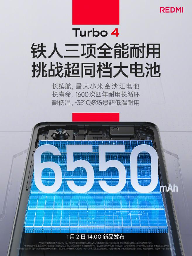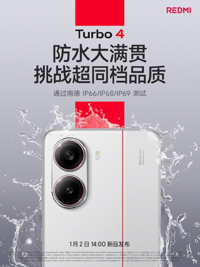 Мобильный телефон Xiaomi REDMI Turbo 4 успешно прошел строгие испытания на водонепроницаемость по стандартам Nande IP66, IP68 и IP69, получив звание «водонепроницаемого гранд-слэма». Данное объявление было сделано во время официального представления смартфона. Устройство будет выпущено в продажу 2 января 2025 года.