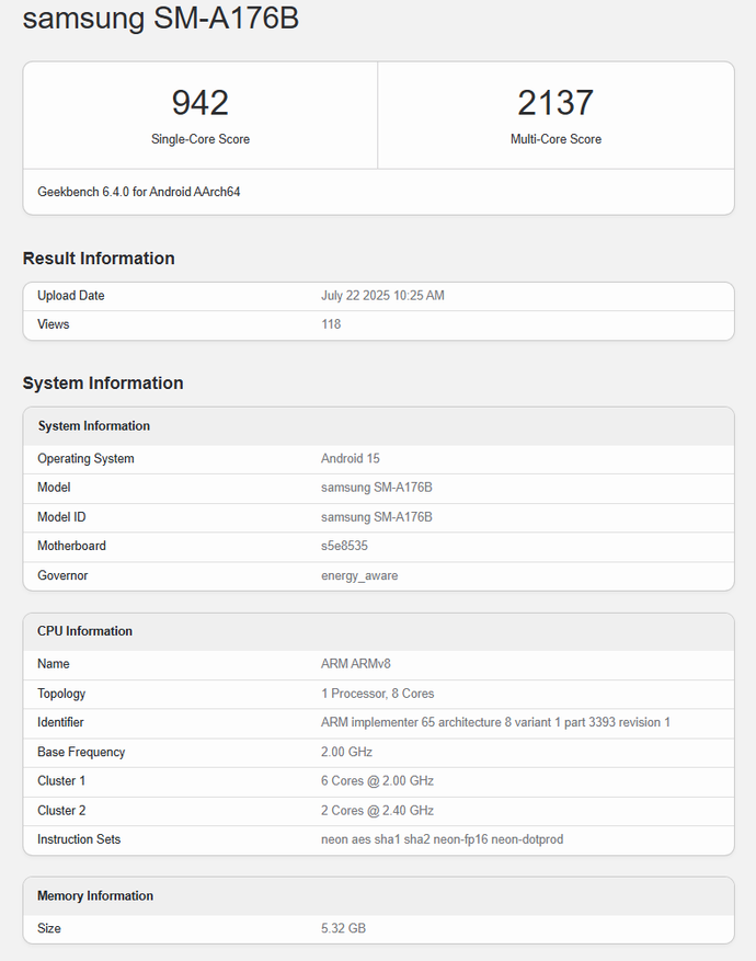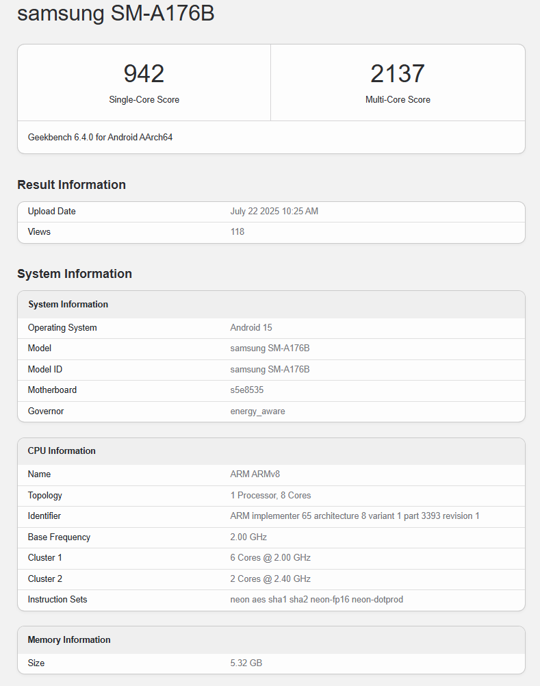 По части «железа» изменений почти нет. Смартфон замечен на Geekbench с чипсетом Exynos 1330 — тем же, что стоит в Galaxy A14 и A16 5G. Это 5‑нм платформа с двумя ядрами Cortex‑A78 и шестью Cortex‑A55, плюс графика Mali‑G68 MP2. Тестовый образец имел 6 ГБ оперативной памяти, но, как и у предшественника, ожидаются версии с 4 и 8 ГБ. Хранилище останется на UFS 2.2 или 3.1.