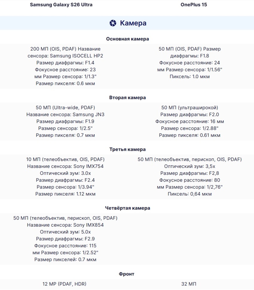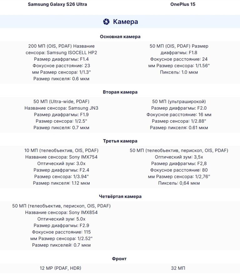На бумаге технические параметры камер смартфона Galaxy выглядят предпочтительнее OnePlus 15. Его основной сенсор больше, а диафрагма — значительно быстрее. Сверхширокоугольная камера также оснащена более крупными пикселями. При рассмотрении телеобъективных камер, Galaxy имеет преимущество в два объектива против одного у OnePlus.