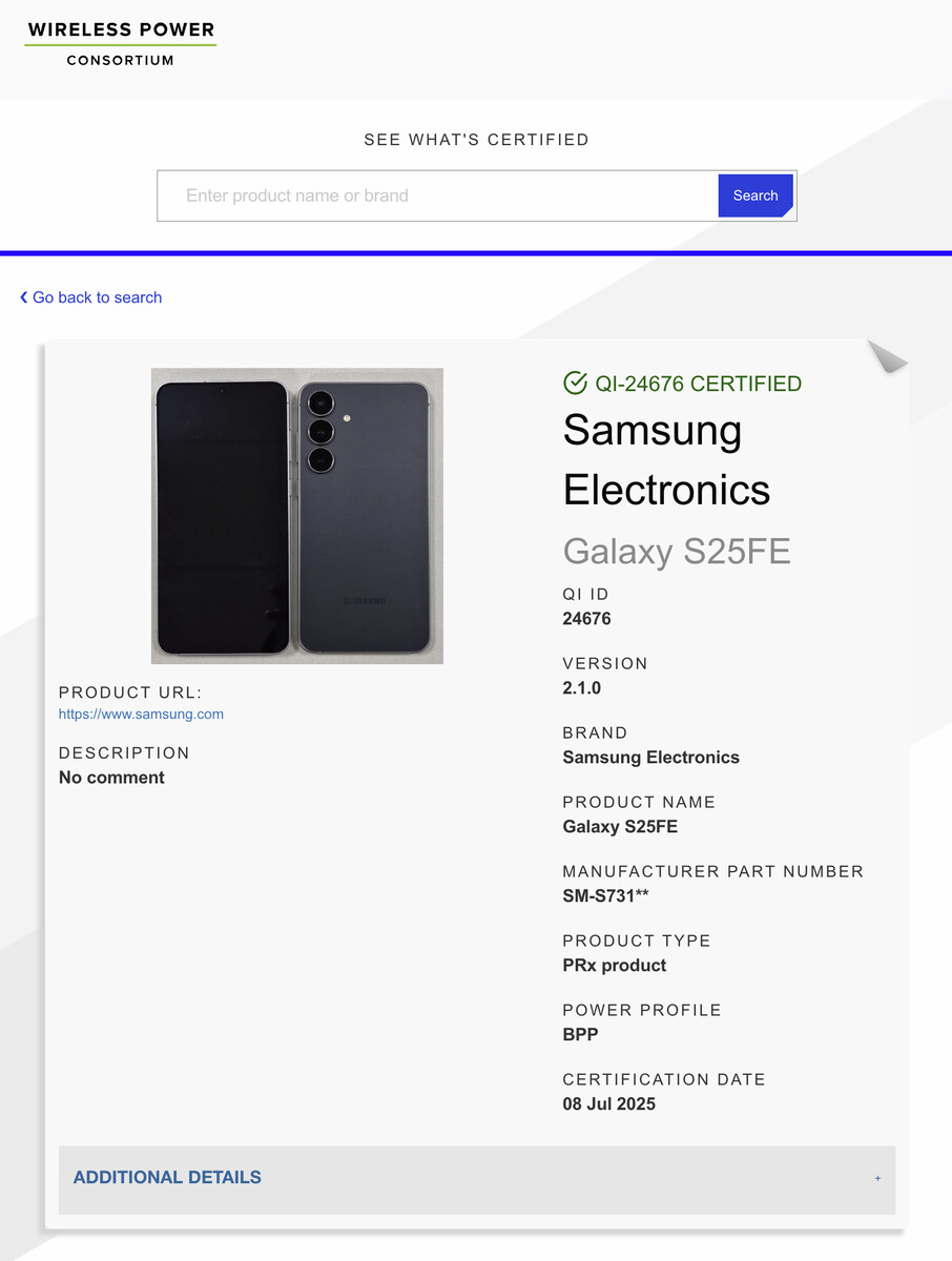 Samsung работает над очередным расширением линейки Galaxy S25 — на этот раз в формате Fan Edition. Согласно утечке от Wireless Power Consortium, в базе сертификации замечена модель Galaxy S25 FE. Устройство получило поддержку стандарта беспроводной зарядки Qi 2.1, а это означает наличие магнитного позиционирования, аналогичного MagSafe. Однако, как и в других устройствах Galaxy S25, магниты, похоже, будут встроены не в сам смартфон, а в совместимые фирменные чехлы.