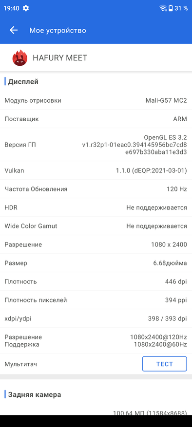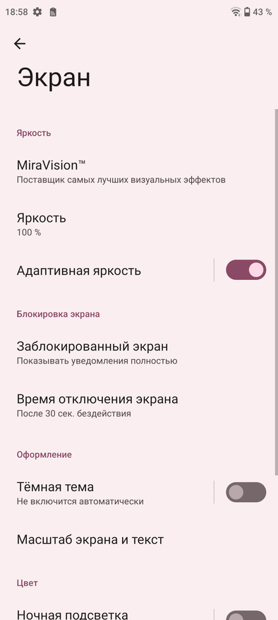 В настройках дисплея не много вариантов его регулирования, все работает при помощи известной MiraScreen. Частота регулируется до 120Гц, что подтверждают бенчмарки. Диагональ дисплея 1080*2400 и тач поддерживает 10 касаний.