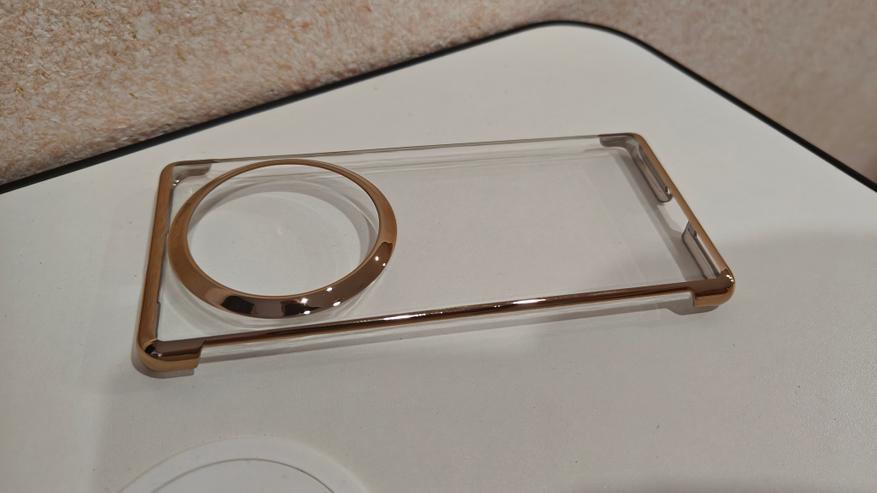Чехол, который чуть попроще также не самый дешевый, он тонкий, облегченный, с жесткими углами и золотыми рамками.