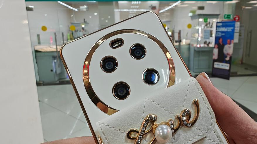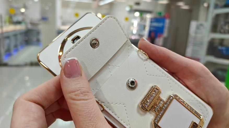 Блок камер полностью защищен белым пластиком. Каждая прорезь имеет золоченую рамку. По центру кармашек для карточек, закрывающийся на кнопку. На кармашке отсека для карты прикреплена блестящая надпись Love с большой жемчужиной в букве О. Снизу изображение флакона парфюма. Эта часть не просто дизайнерское решение, оно же имеет функцию держателя смартфона «на боку» и также распахивается и открывает вид на косметическое зеркальце.