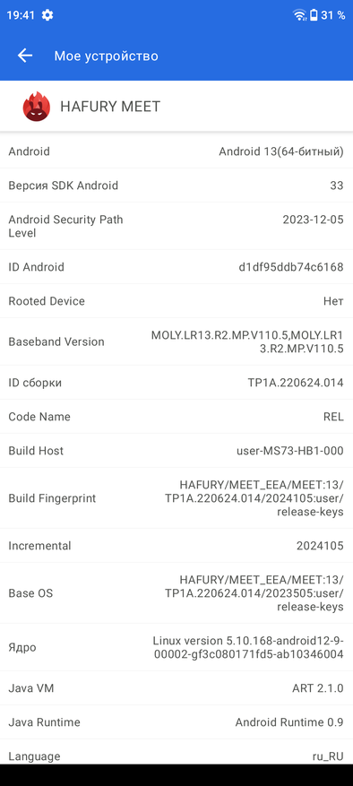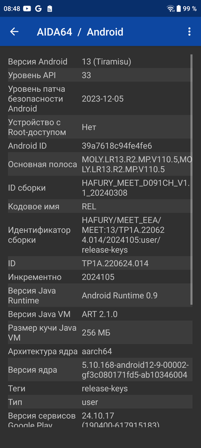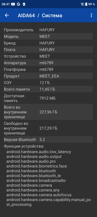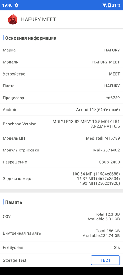 Работает смартфон на андроиде 13. Операционная система совсем без китайского софта и рекламы, но не все пункты меню локализованы на русский. Локализовано процентов 95. Система занимает 8,5ГБ из 256ГБ накопителя. Оперативную память в 12Гб можно еще расширить на 12ГБ из виртуальной области постоянной памяти.