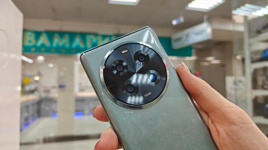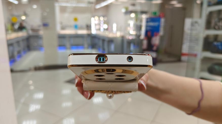 На нижней части есть еще данные о модели и значки сертификации качества. Верхнюю половину почти всю занимает блок камер. Он размещен по центру, как в моделях Vivo X100 pro и Huawei 12i. Блок камер выпирает из плоскости задней стенки, а ободки окрашены в хром. Вспышка встроена отдельно от объективов, сверху.