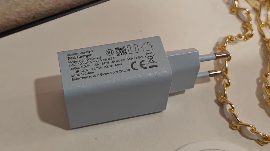 Зарядное устройство на 33Вт и окрашено в цвет смартфона. Цепочка интересная, напоминает цепочки сумочек клатчей.