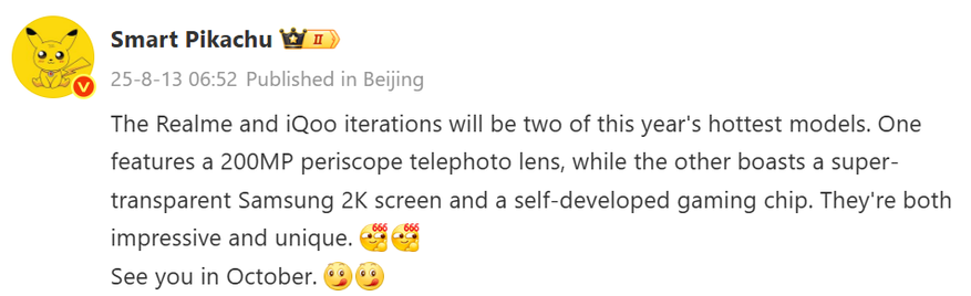 Во второй половине года китайский рынок смартфонов ждёт заметное обновление флагманского сегмента. Если в сентябре на себя внимание перетянет Xiaomi с серией Xiaomi 16, то в октябре на сцену выйдут Realme и iQOO. Информатор Smart Pikachu утверждает, что оба бренда представят свои новинки практически одновременно.