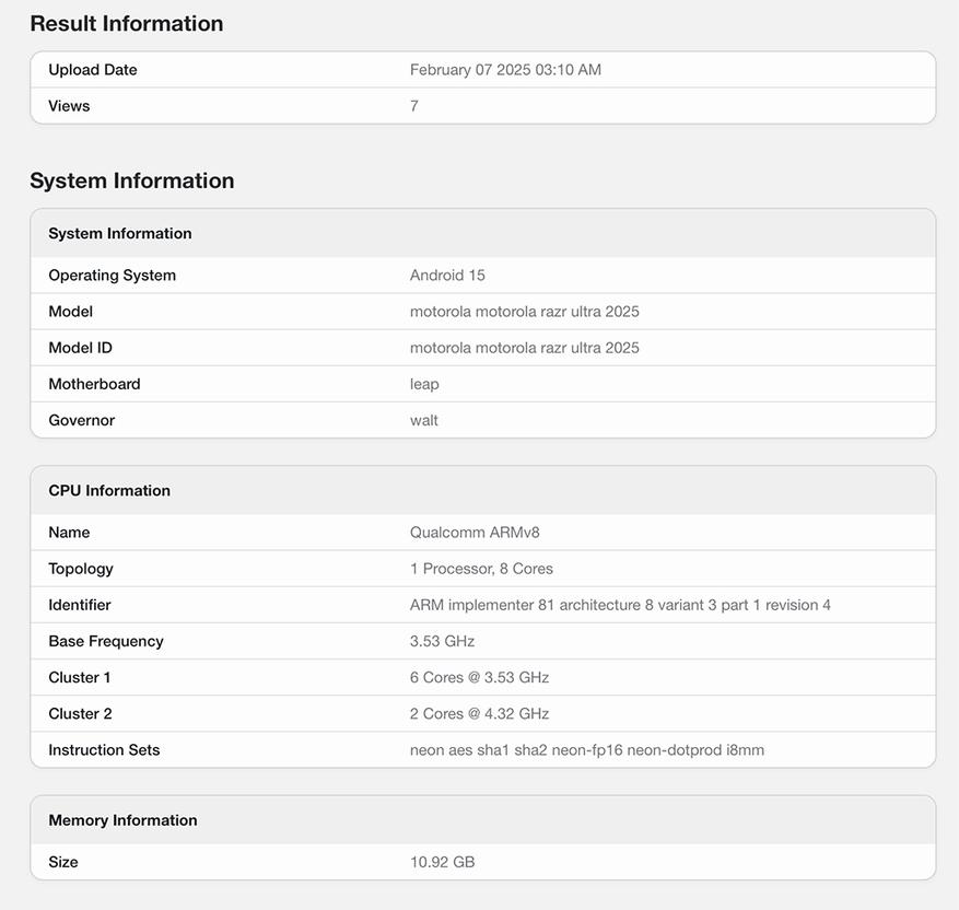 В материале издания отмечается, что новые утечки в Сети свидетельствуют о том, что следующее поколение Razr Plus (2025), известное за пределами США как Razr Ultra 60, появилось на платформе тестирования производительности процессоров Geekbench. Издание предполагает, что Motorola может оснастить устройство мощным чипсетом Snapdragon 8 Elite — новейшим чипсетом Qualcomm, выпущенным в конце 2024 года.