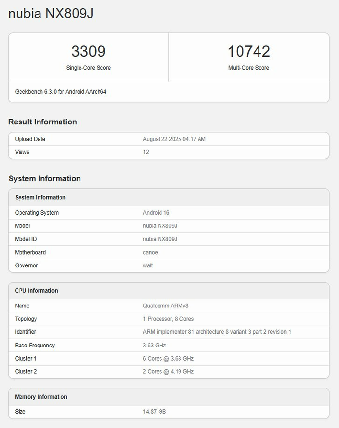 Судя по тесту, чип получил два производительных ядра на 4,19 ГГц, ещё шесть — на 3,63 ГГц, а за графику отвечает Adreno 840. Устройство оснастили 16 ГБ оперативной памяти и Android 16. В одноядерном режиме Red Magic 11 Pro набрал 3309 баллов, в многоядерном — 10 742.