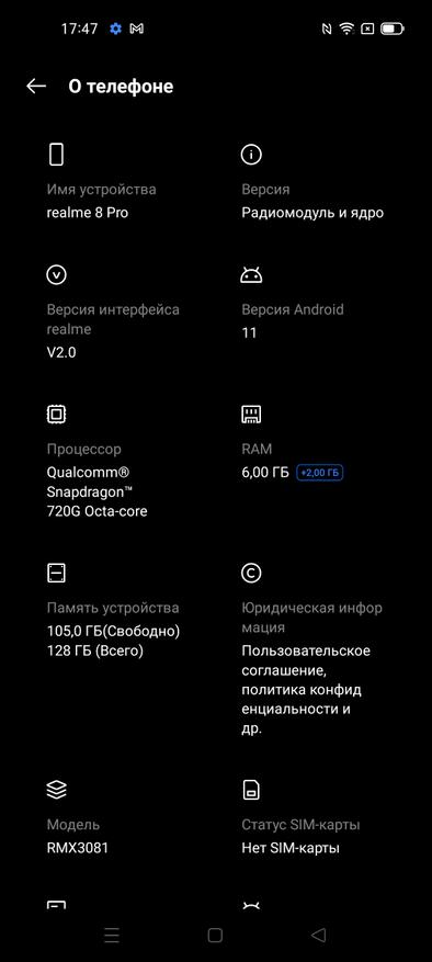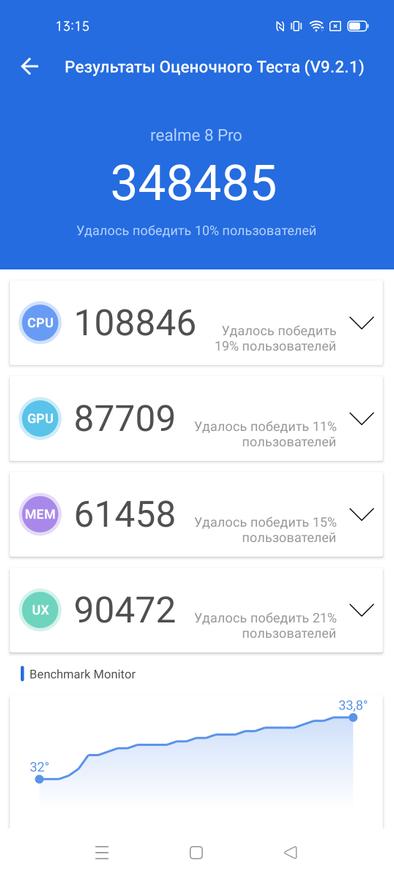 В плане железа Realme 8 Pro не блистает выдающимися характеристиками. Процессор Snapdragon 720G вкупе с видео ускорителем Adreno 618 и оперативной памятью USF 2.1 выдаёт порядка 320-350 тысяч попугаев в синтетическом тесте AnTuTu. Процессор 8-ядерный выполнен по 8нм техпроцессу. Железо не самое новое, но смартфон довольно-таки неплохо ведет себя с ним. Это заслуга программной оболочки и правильной оптимизации. Если пройтись по основным бенчмаркам, то в AnTuTu набирает 348 тысяч баллов, в Geekbench single-core 571 и 1667 в multi-core.
