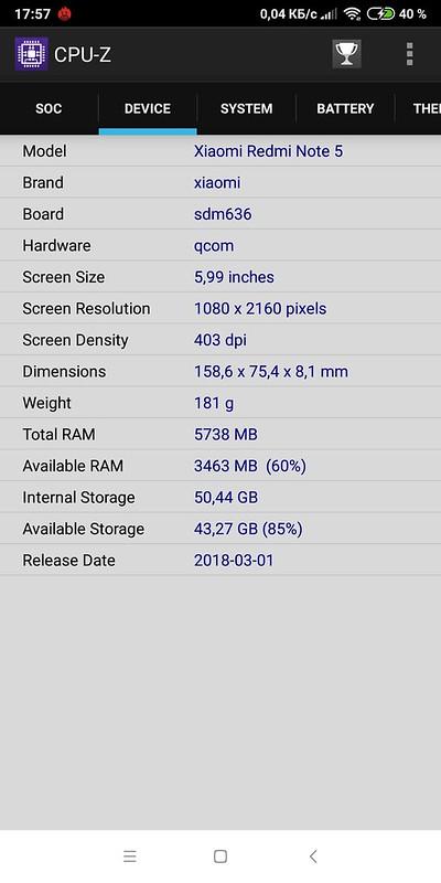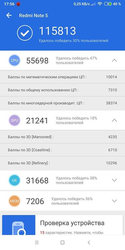 Экран имеет высокую максимальную яркость и обладает отличными антибликовыми свойствами, поэтому устройством без особых проблем можно будет пользоваться вне помещения даже летним солнечным днем. В полной темноте яркость можно понизить до комфортного уровня. Допустимо использовать и режим с автоматической подстройкой яркости, работающий адекватно, с естественной цветопередачей, высоким разрешением и отличными углами обзора. Также к достоинствам экрана нужно отнести наличие эффективного олеофобного покрытия, отсутствие воздушного промежутка в слоях экрана и видимого мерцания, высокий контраст. Что любопытно, для Xiaomi Redmi Note 5 доступна разблокировка по лицу, и для относительно бюджетного смартфона она работает прилично. Но появляется она в телефоне если выставит регион Индия. Емкость встроенного аккумулятора составляет 4000 мАч. В режиме обычного использования (практически без игр и ютуба), но с постоянным использованием социальных сетей, мессенджеров и автоматической регулировке яркости, время автономной работы составило чуть более 2,5 дней.