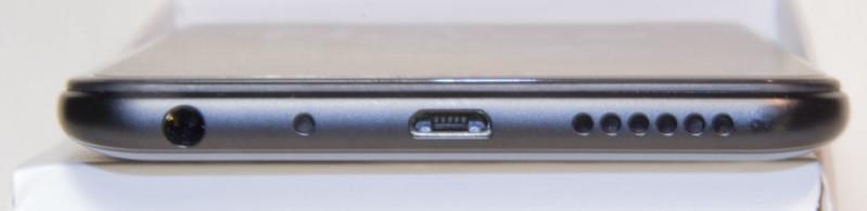 На нижней грани расположили порт microUSB (Непонятно почему не модный Type-C? Когда, наконец, иссякнут запасы Micro-USB на китайских фабриках?), сеточку внешнего динамика, миниджек для наушников и отверстие микрофона.