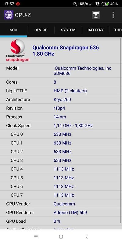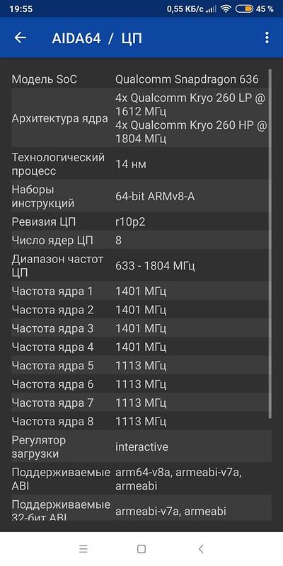 - Процессор: восьмиядерный Qualcomm Snapdragon 636, (4х 1,8 ГГц, 4х 1,6 ГГц)