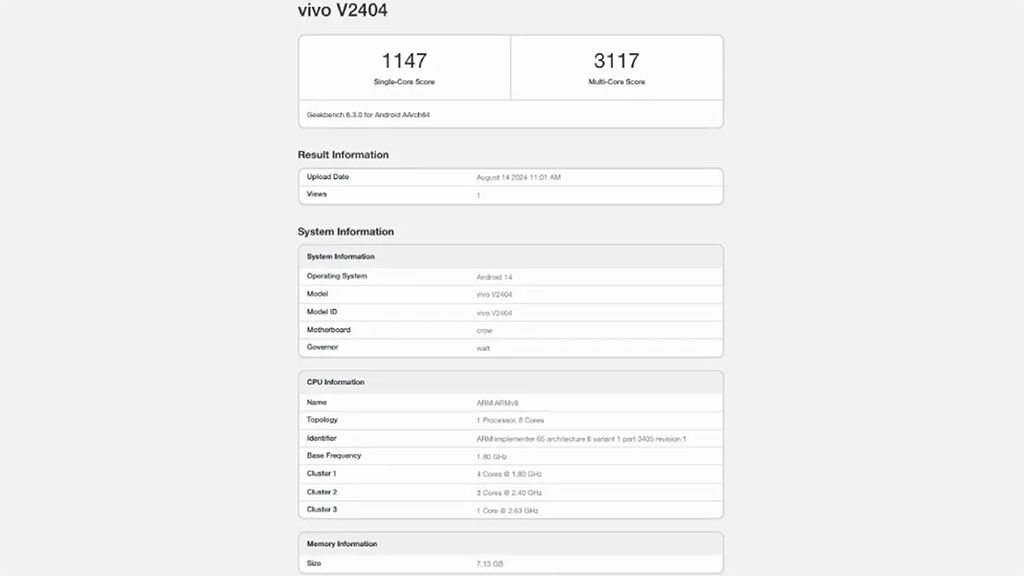 Устройство Vivo T3 Pro на платформе Geekbench замечено под номером модели vivo V2404. Согласно данным соответствующего сайта, аппаратная составляющая девайса базируется на основе восьмиядерного процессора конфигурации 4 + 3 + 1, процессор подтверждён как Snapdragon 7 Gen 3, у которого самое быстрое ядро работает на частоте 2,63 ГГц. Работает он в паре с 8 GB ОЗУ (оперативная память) и графическим процессором Adreno 720. В устройстве реализована функция поддержки 5G сетей для передачи мобильных данных. Управляет всеми процессами в устройстве операционная система Android 14.