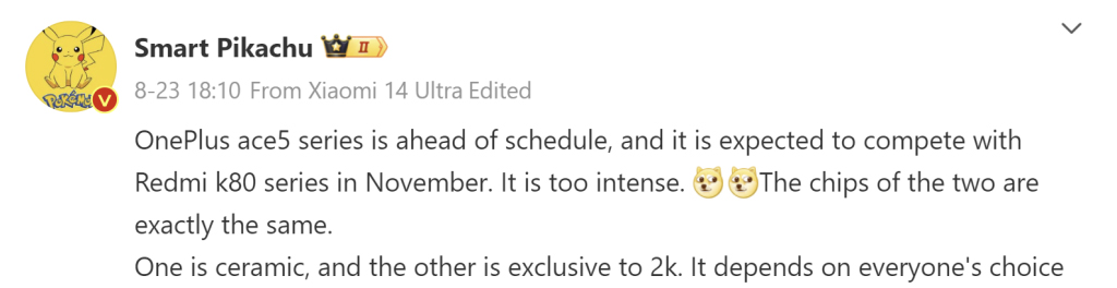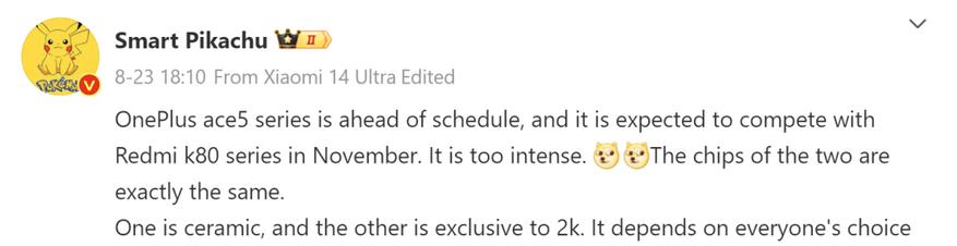 По его предположению, два чипа, на которых работает серия Ace 5, будут такими же, как и в серии Redmi K80. Это говорит о том, что Snapdragon 8 Gen 3 может быть установлен в Ace 5, а Snapdragon 8 Gen 4 — в Ace 5 Pro. Инсайдер утверждает, что стандартная модель будет иметь керамический корпус, тогда как вариант Pro будет оснащен экраном с разрешением 2K. По словам Smart Pikachu, линейка K80 столкнется с конкуренцией со стороны серии OnePlus Ace 5.