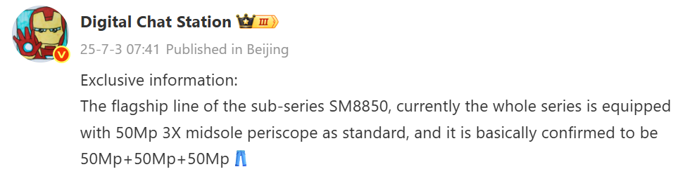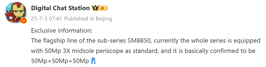 Что интереснее — камеры. Оба аппарата получат 50-Мп перископ с 3-кратным зумом, базовый сенсор того же разрешения и сверхширокоугольный модуль — тоже 50 Мп. Утечка от Digital Chat Station указывает, что речь идёт о конфигурации 50+50+50.