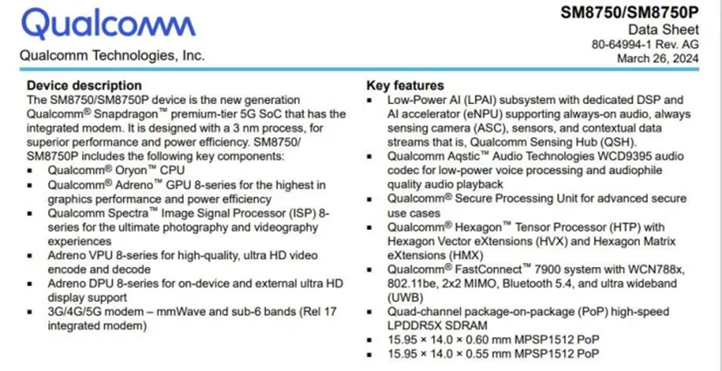 В опубликованном техническом описании указывается, что Qualcomm будет создавать чипсет Snapdragon 8 Gen 4 на основе передового 3-нм технологического процесса. Тем самым обещая значительные улучшения как производительности, так и энергоэффективности. Он будет оснащён новейшим процессором Oryon от Qualcomm, разработанным для обеспечения высокопроизводительных вычислений. А также графическим процессором Adreno 8-й серии, который разработан для обеспечения графических возможностей высшего уровня и подходит для игр и других требовательных задач. Чипсет поддерживает двухканальную высокоскоростную LPDDR5X SDRAM-память package-on-package (PoP).
