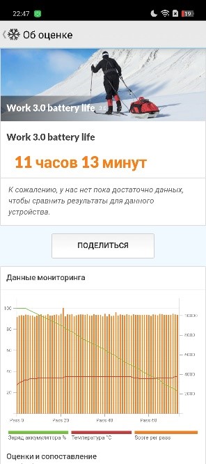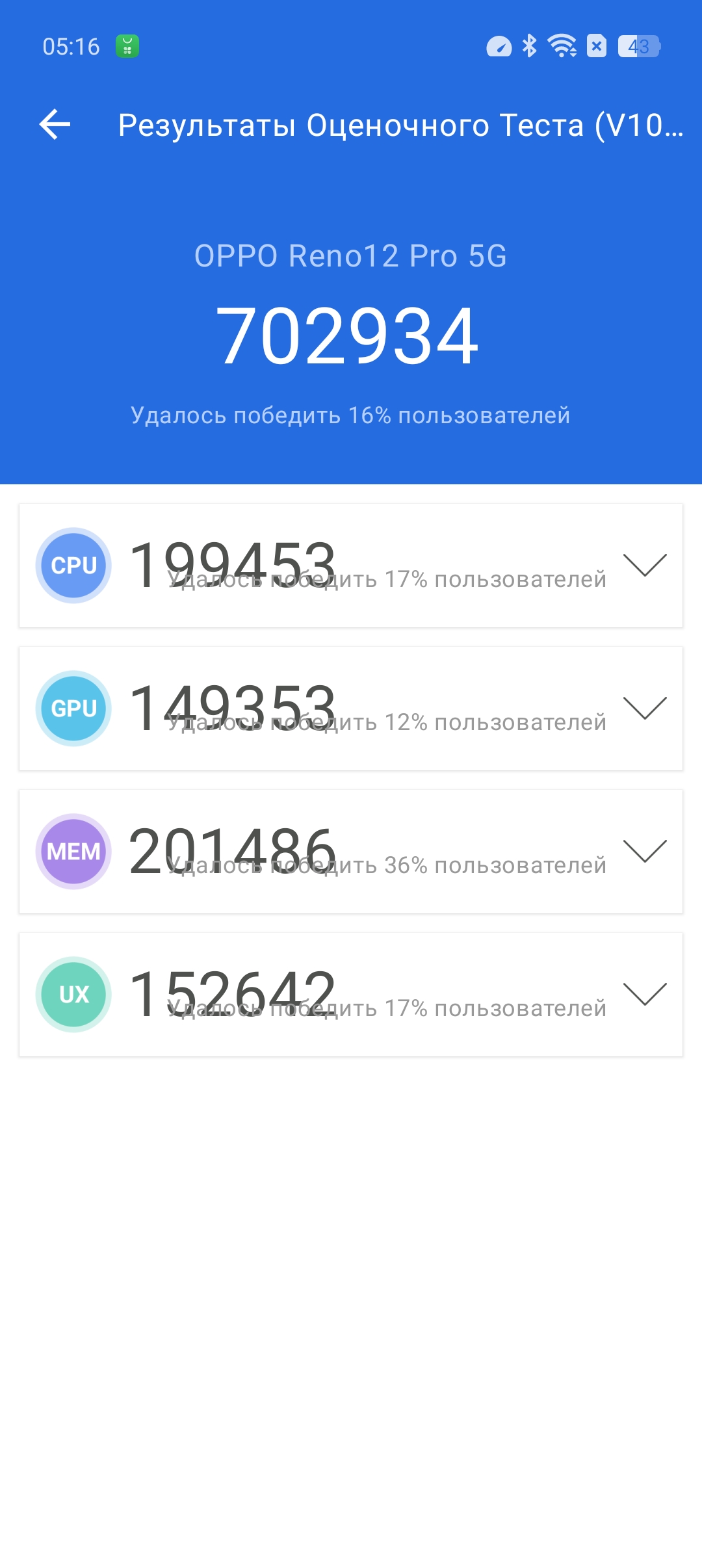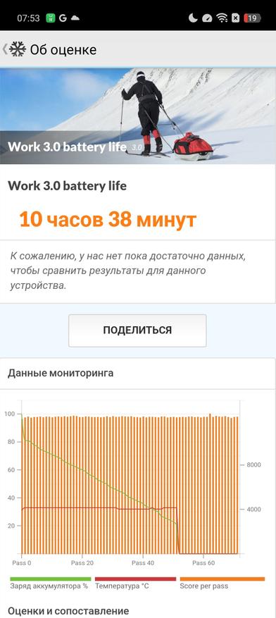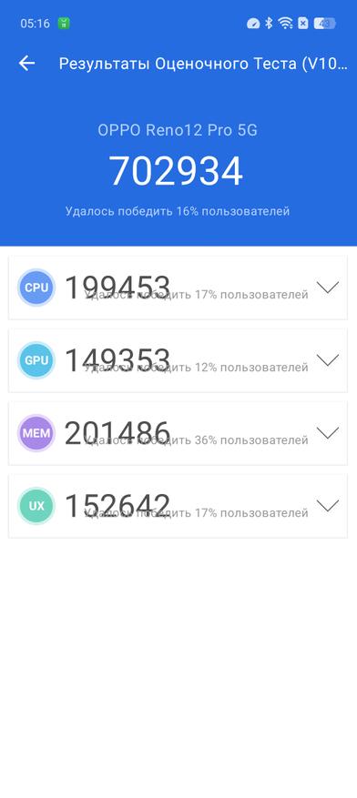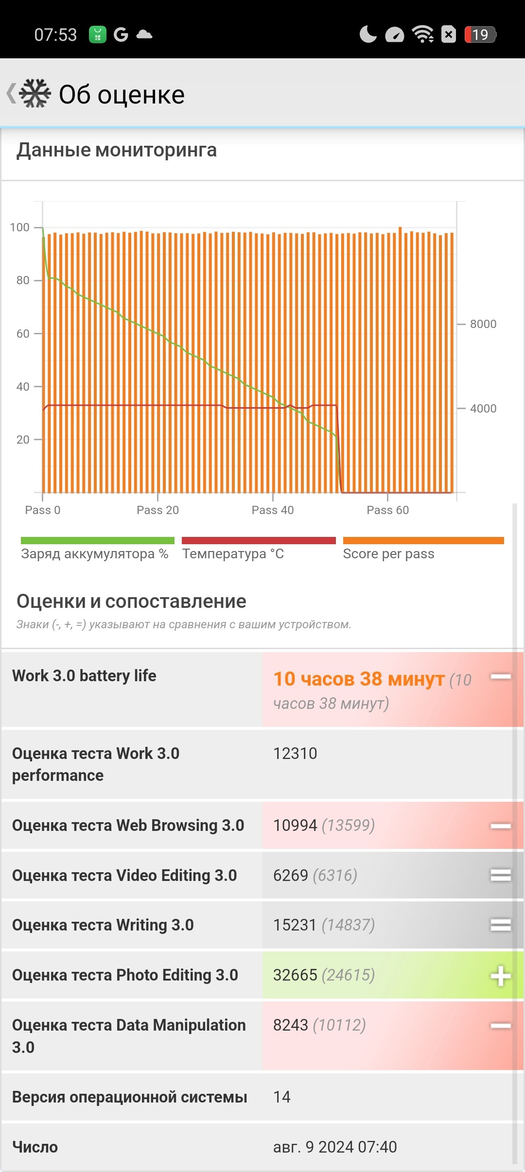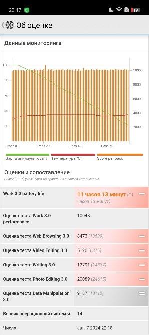 OPPO Reno12 Pro получил аккумулятор на 5000мА*ч, обеспечивающий 11 часов 13 минут работы экрана в обычном режиме и 10 часов 38 минут в режиме высокой производительности. Оба теста производились при 100% яркости в тесте PCMark Work 3.0 battery life.