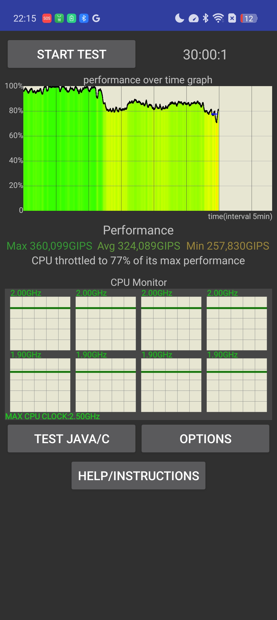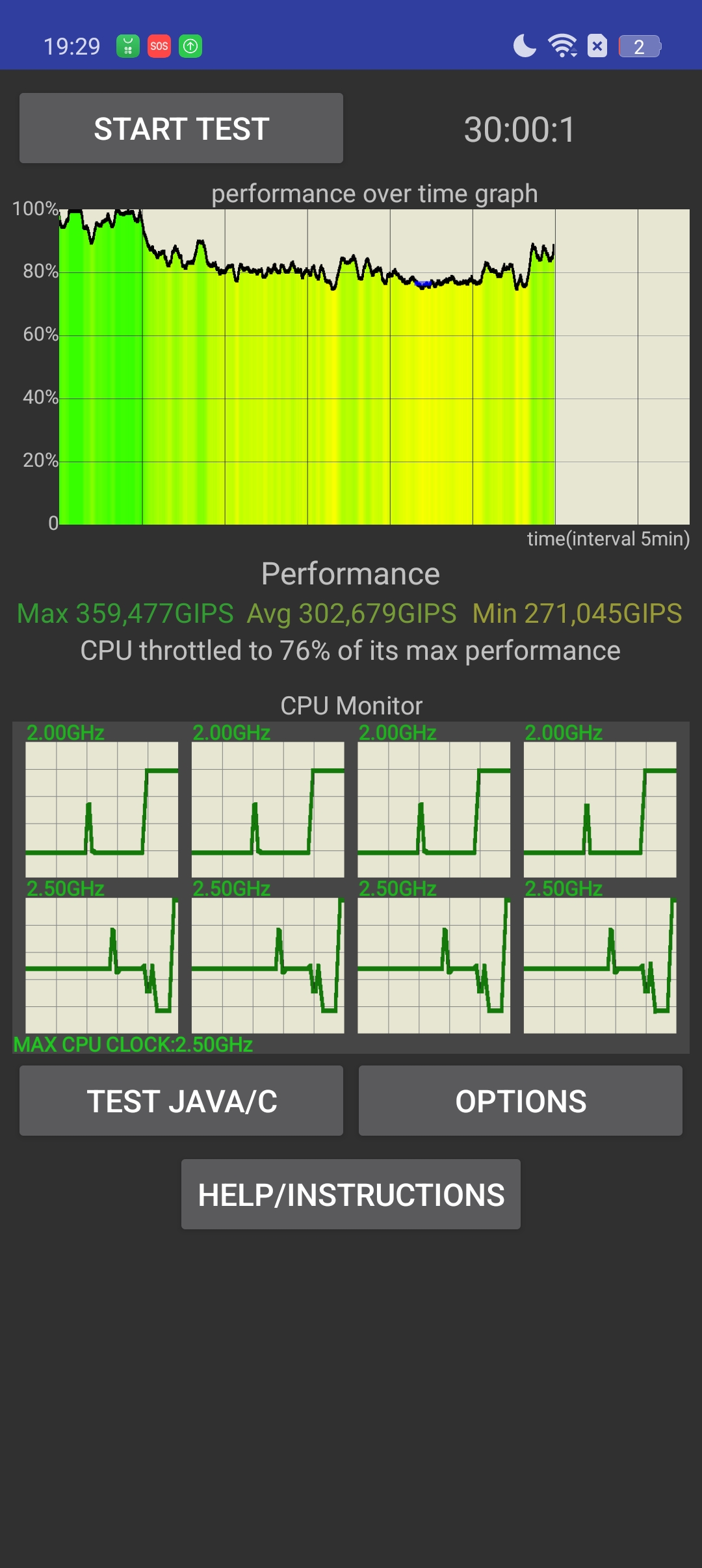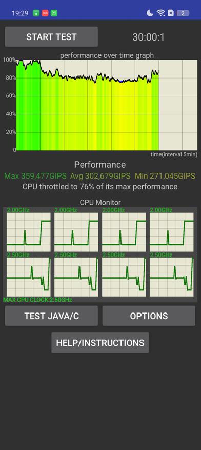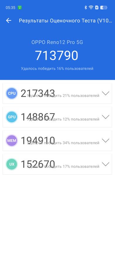 Как и в случае в OPPO Reno12 F, обозреваемая модель получила режим повышенной производительности. Его активация напрямую влияет на скорость работы с внутренним накопителем, тогда как работа с CPU и GPU остается практически неизменной. В качестве аппаратной платформы выступает MediaTek Dimensity 7300 — однокристальная система, выполненная по 4нм технологическому процессу и представленная в июне 2024 года. В своей структуре имеет 4 ядра Cortex-A78 с частотой 2.5 Ггц и 4 ядра Cortex-A55 с частотой 2 ГГЦ. В качестве видеоядра выступает Mali-G615 MP2, а за дополнительную обработку ИИ отвечает выделенный чип MediaTek APU 655. В популярных бенчмарках OPPO Reno12 Pro набирает 703/713к очков в Antutu10, а также 1057/3008 очков в однопоточном/многопоточном тестах в Geekbench 6. Касательно троттлинга, режим повышенной производительности демонстрирует прибавку среднего значения с 302 до 324 GIPS. За время одной игровой сессии (29 минут) в PUBG Mobile смартфон даже не успевает нагреться.