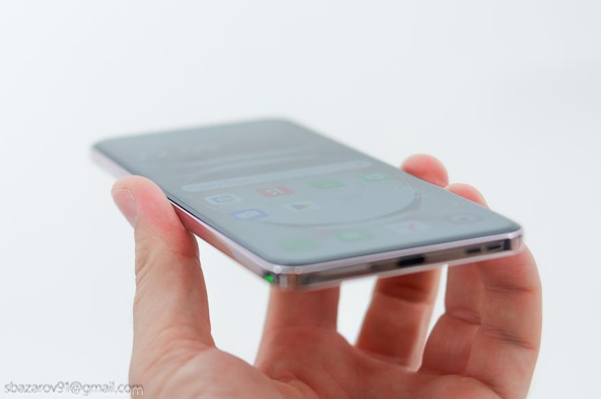 Практически всю переднюю часть смартфона занимает 6.7-дюймовый изогнутый AMOLED дисплей с разрешением FHD+ (2412*1080 пикселей) и полезной площадью в 93.5%. Экран имеет закругления на всех четырех сторонах с одинаковой высотой и отличается от стандартных Curved-дисплеев, представляя собой нечто среднее между гибкими и плоскими дисплеями. Частота обновления составляет 120 Гц, а частота дискретизации сенсорного слоя достигает 240 Гц. Датчик приближения физический, расположен чуть правее фронтальной камеры. Слуховой динамик совмещен с основным динамиком, из-за чего разговоры по телефону будут слышны не только вам.. Фронтальная камера на 50Мп получила автоматическую фокусировку, изменение поля кадра (0.8/1/2х), а также съемку в 4К@30fps.