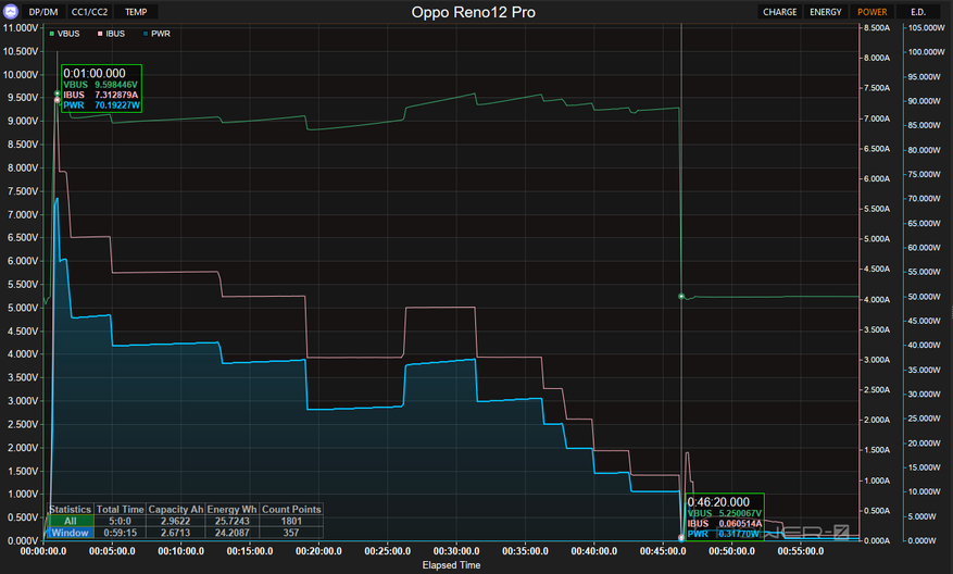 Процесс зарядки лучше всего виден на графике, где показана максимальная мощность потребления 70 Вт (9,6В ⎓7,3А).