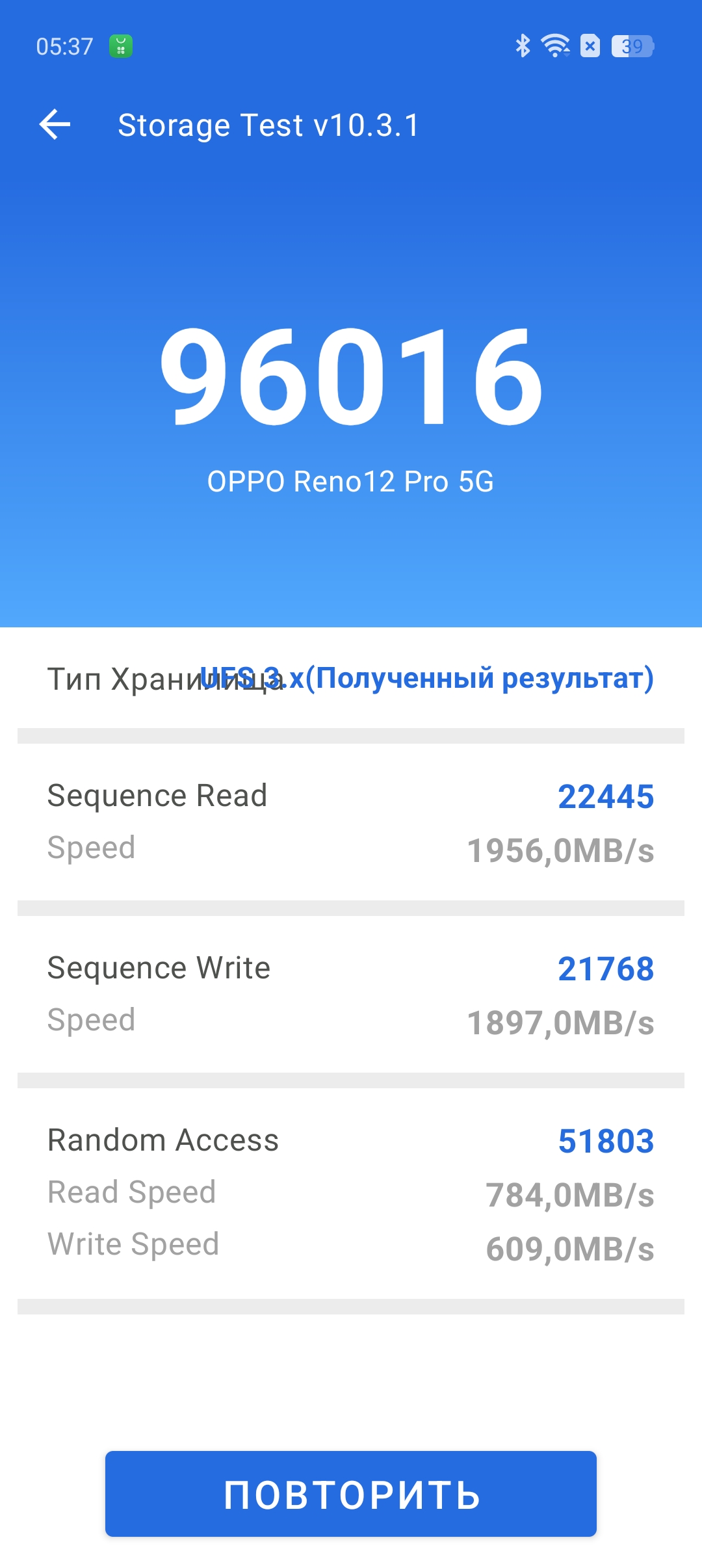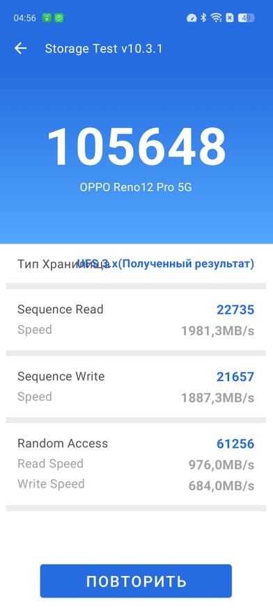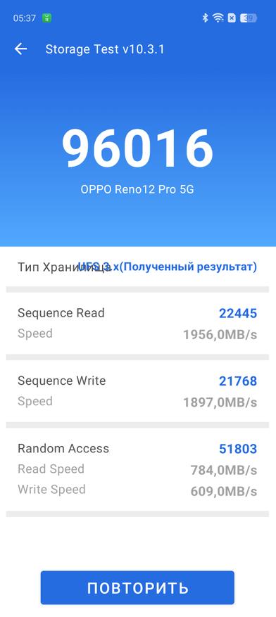 LPDDR5 RAM с базовым объёмом 12 ГБ и возможностью расширения до 24 ГБ благодаря внутреннему хранилищу. UFS 3.1 флеш-память на 512 ГБ. Основные характеристики накопителя: высокая скорость чтения — 1,96 ГБ/с и записи — 1,9 ГБ/с. При активации производительного режима увеличивается скорость записи и чтения случайных данных, что особенно заметно при работе с небольшими файлами. В целом, Dimensity 7300 — шустрый процессор, который со слов MediaTek позволил снизить на 25 % энергопотребление ядер Cortex-A78 за счет перехода на 4 нанометра.