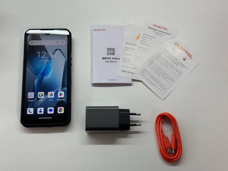 Внутри коробки находится сам смартфон в силиконовом чехле, документация, в том числе толстая инструкция, брошюра с быстрым руководством и гарантийный талон. Также в комплекте зарядное устройство на 33 Вт и кабель USB-C — USB-C.