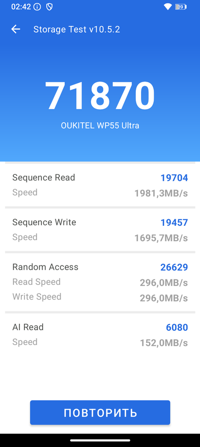 Оперативная память составляет 16 ГБ, встроенная — 512 ГБ. В AnTuTu 10 устройство набирает около 500 тысяч баллов, в 11 версии результат достигает 650 тысяч. В тесте памяти смартфон набирает более 71000 баллов. Скорость чтения и записи на скриншоте ниже. Мультитач ограничен 3-мя касаниями.