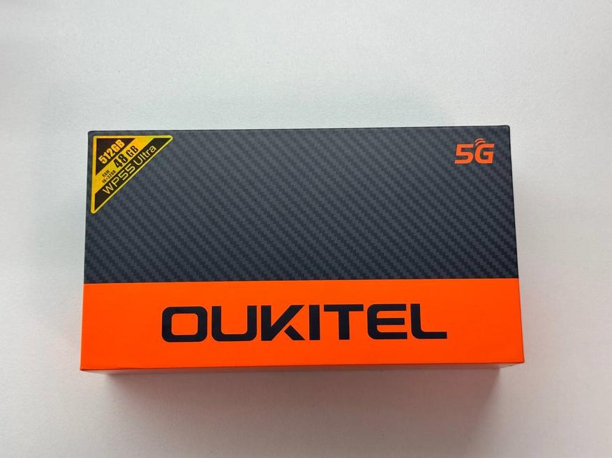 Устройство поставляется в фирменной коробке Oukitel с минимальным оформлением. Верхняя часть выполнена в сером цвете, стилизованном под карбон, нижняя имеет оранжевый оттенок. На лицевой стороне большими буквами нанесено название бренда и модели, сверху указаны объёмы оперативной и постоянной памяти, а также возможность их расширения с 16 до 48 ГБ за счёт файла подкачки. На обратной стороне перечислены основные характеристики: процессор, поддерживаемые модули связи и камеры.