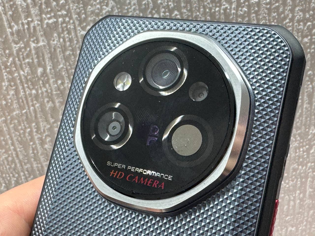 Задняя часть корпуса выполнена из серого пластика с рельефом. Камерный блок обрамлён металлическим кольцом, но оно играет скорее декоративную, чем защитную роль.