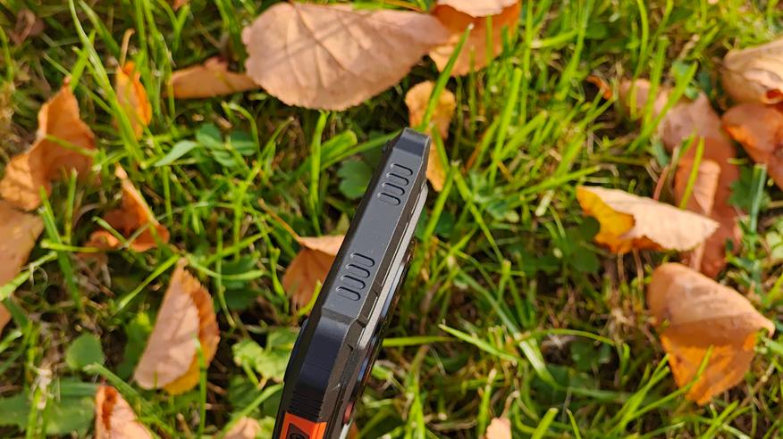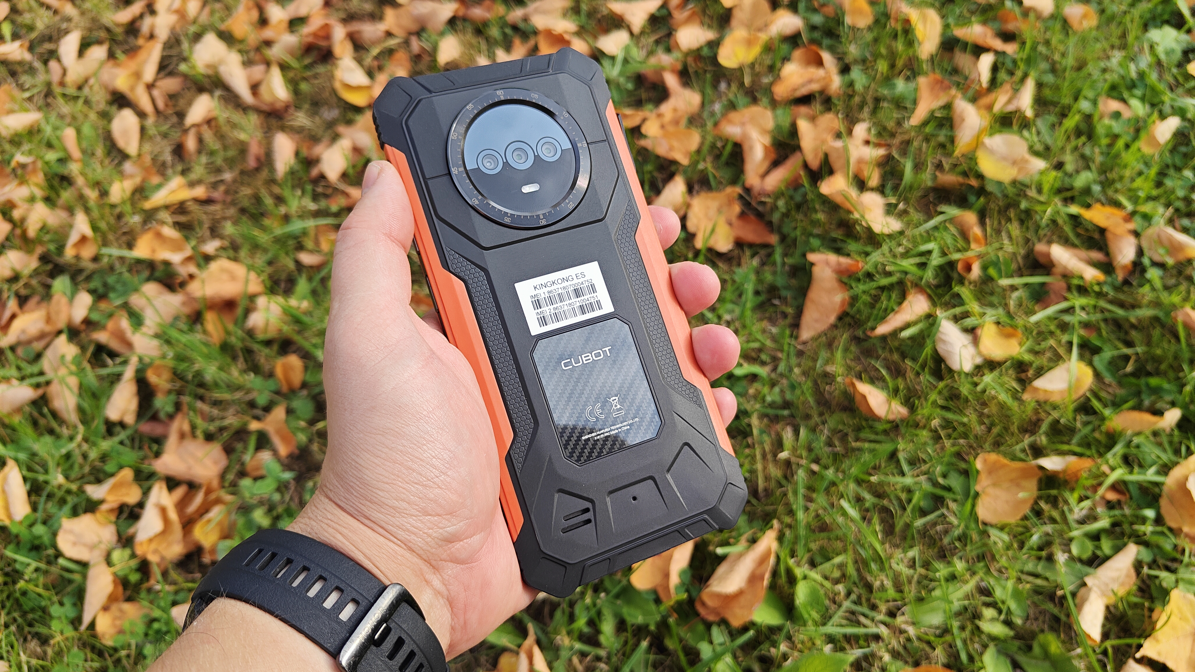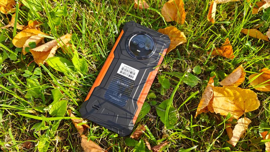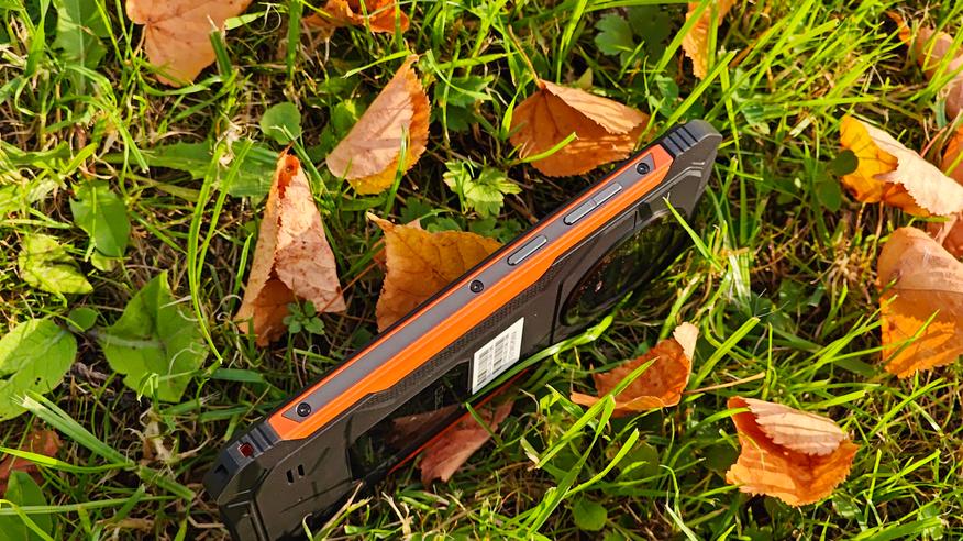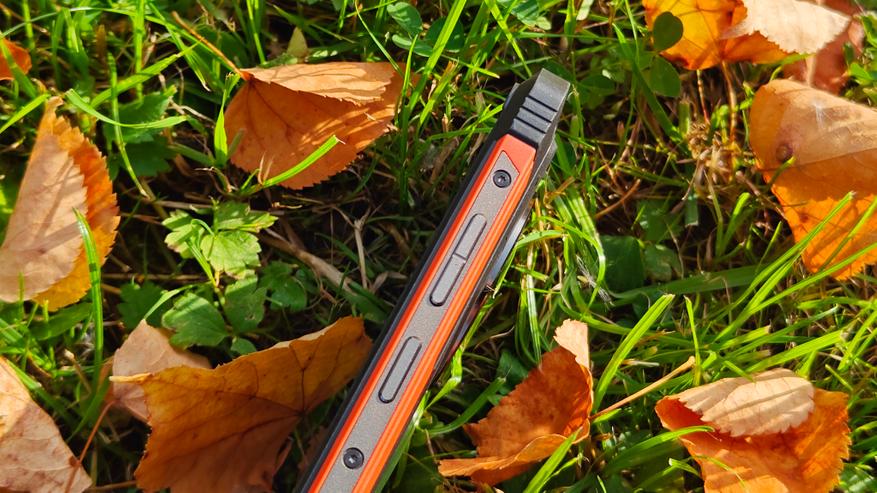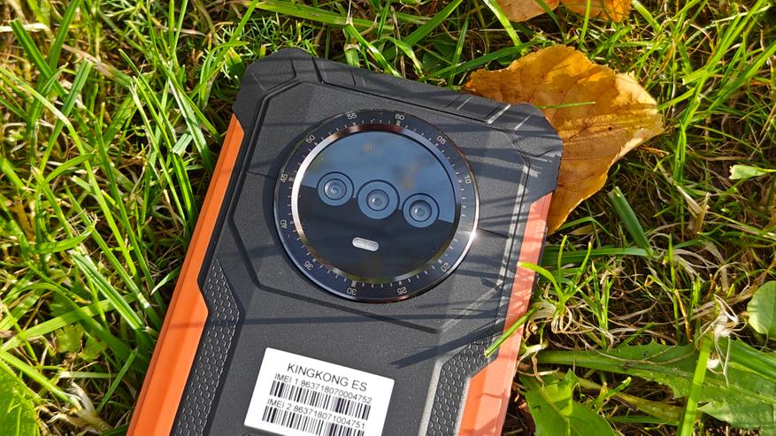 На задней крышке, покрытой резиной, явно выделяется площадка с указанием бренда, украшенная карбоном, отверстия динамика, компенсационное отверстие и большой блок камер. Двойного дисплея нет, но он в принципе и не нужен. Блок камер вписан в круглый безель с циферблатом, напоминающий часы GS Pro от Honor. Безель металлический, выпуклый и защищает стекло, закрывающее камеры. На блоке камер разместили 3 объектива, только один из которых является по-настоящему современной камерой. Под объективами отдельно встроен мощный светодиод вспышка, выполняющий роль фонарика. На нижней части крышки видим отверстия динамика и компенсационное отверстие. Концепция дизайна полностью отражает суть аппарата — телефон для сложных условий, а оранжевые вставки хорошо выделяют телефон, если он упал в траву.