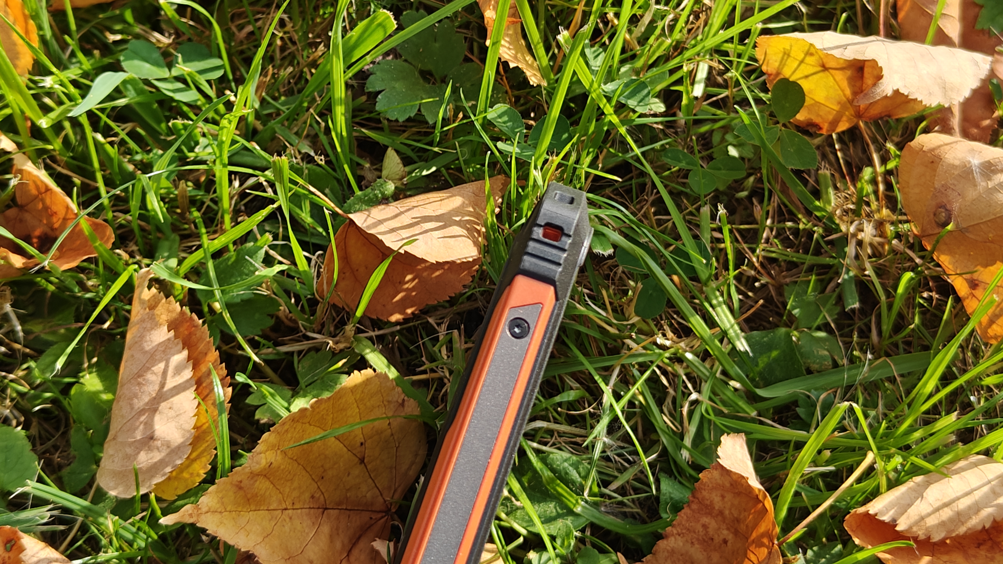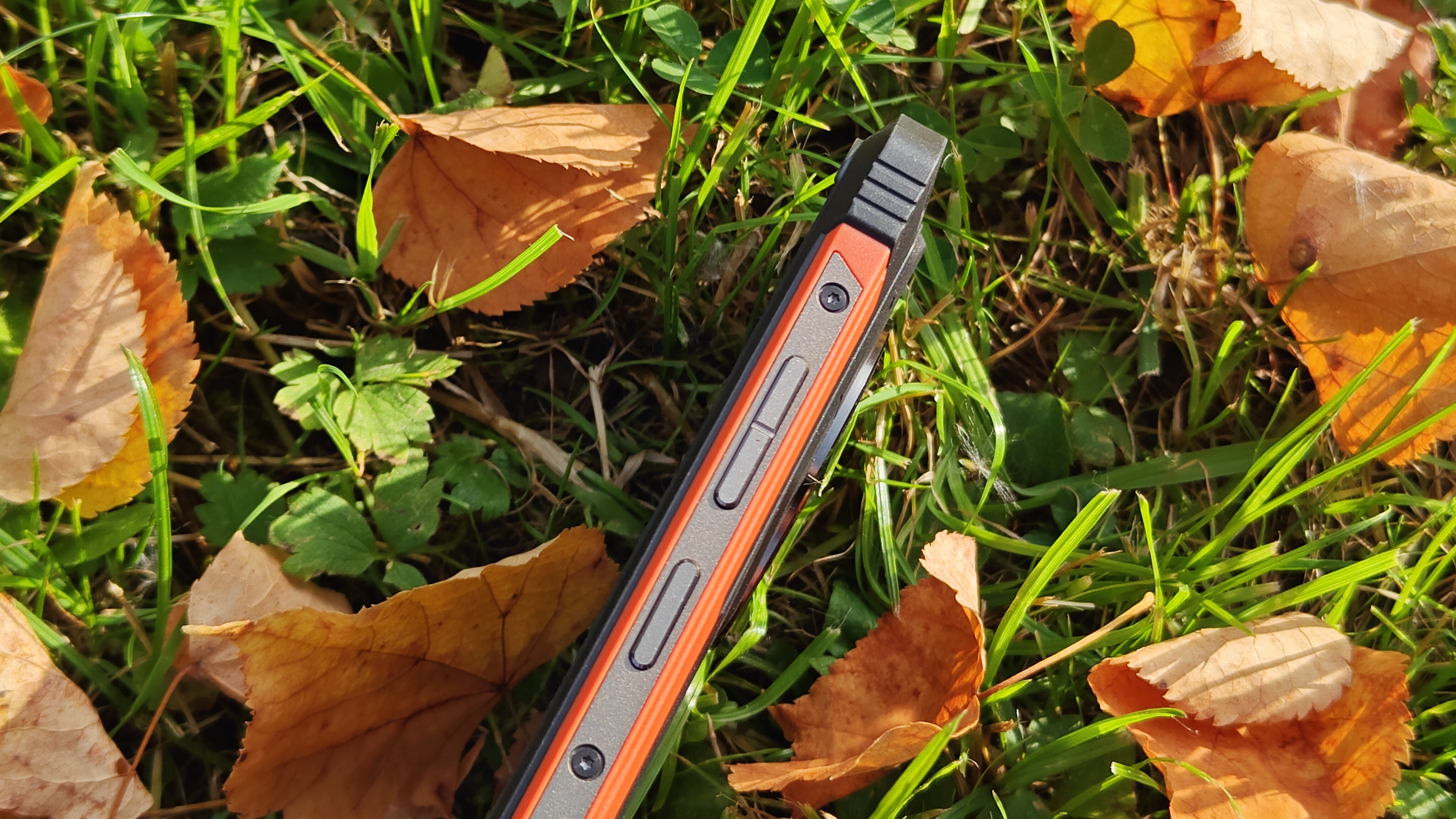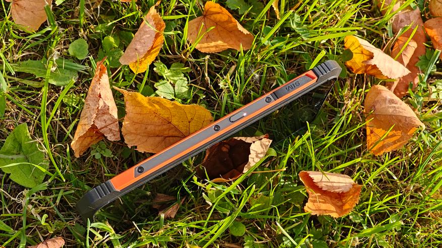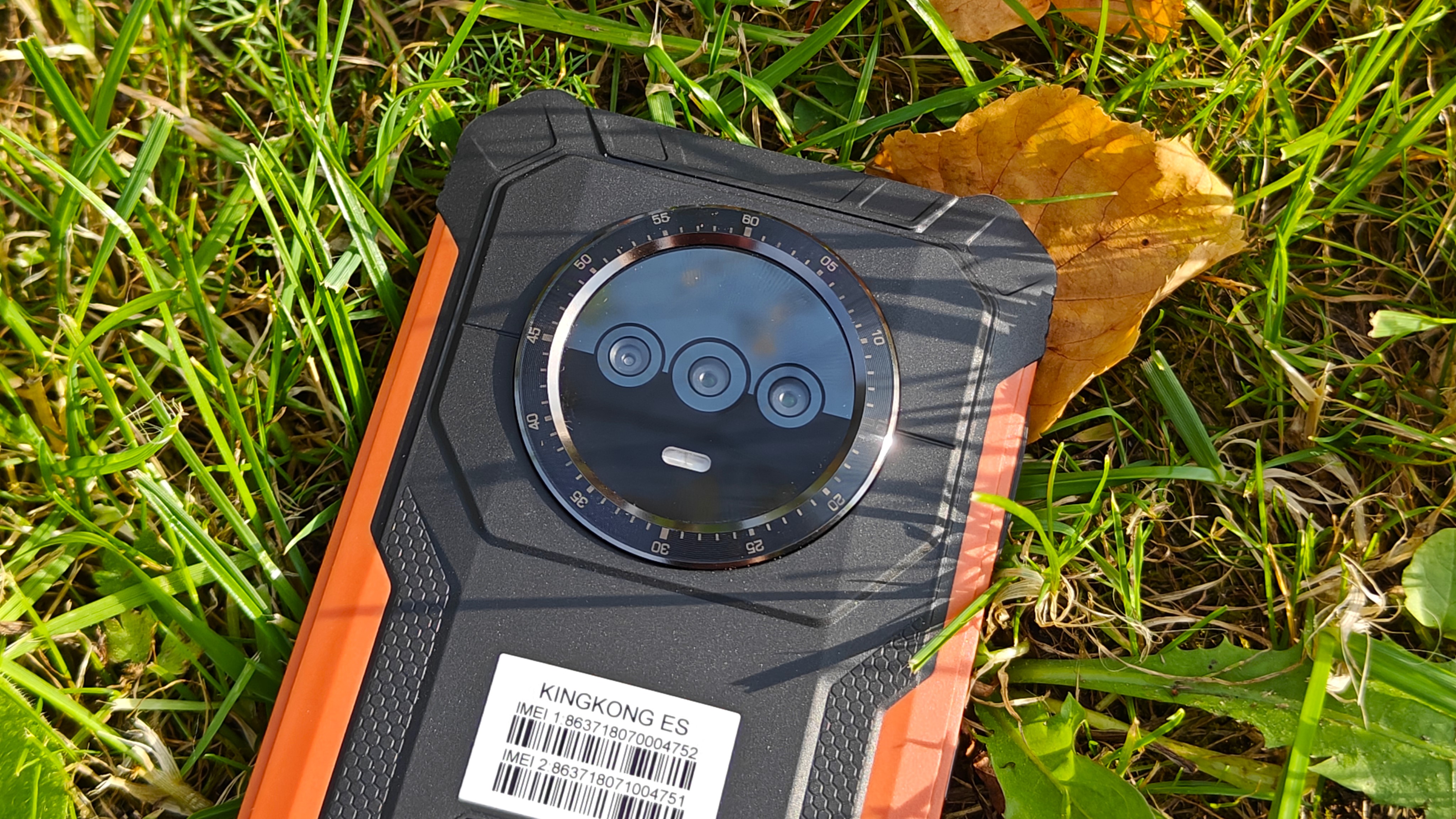 На задней крышке, покрытой резиной, явно выделяется площадка с указанием бренда, украшенная карбоном, отверстия динамика, компенсационное отверстие и большой блок камер. Двойного дисплея нет, но он в принципе и не нужен. Блок камер вписан в круглый безель с циферблатом, напоминающий часы GS Pro от Honor. Безель металлический, выпуклый и защищает стекло, закрывающее камеры. На блоке камер разместили 3 объектива, только один из которых является по-настоящему современной камерой. Под объективами отдельно встроен мощный светодиод вспышка, выполняющий роль фонарика. На нижней части крышки видим отверстия динамика и компенсационное отверстие. Концепция дизайна полностью отражает суть аппарата — телефон для сложных условий, а оранжевые вставки хорошо выделяют телефон, если он упал в траву.