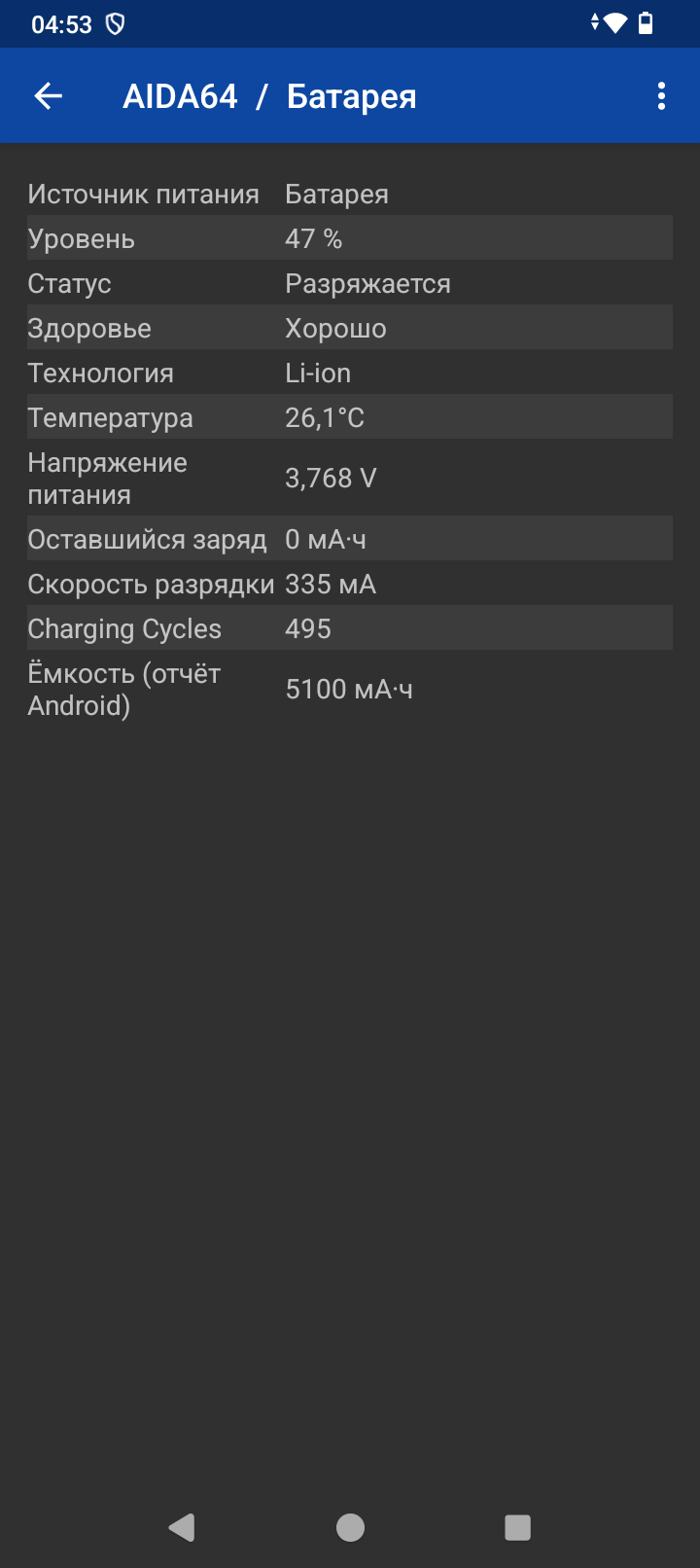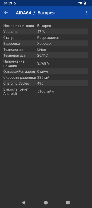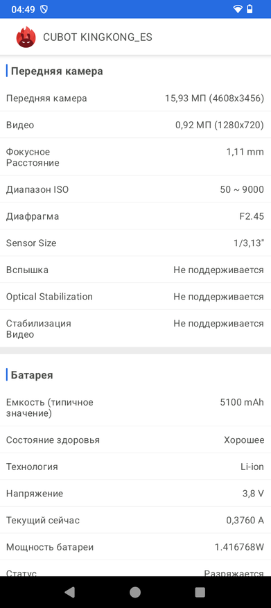 Аккумулятор в смартфоне установлен с заявленной емкостью 5100мАч. Тестер расчета емкости рассчитал 4700мАч, без учета потерь на сопротивление проводов и самого тестера, что немного меньше заявленного.