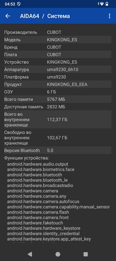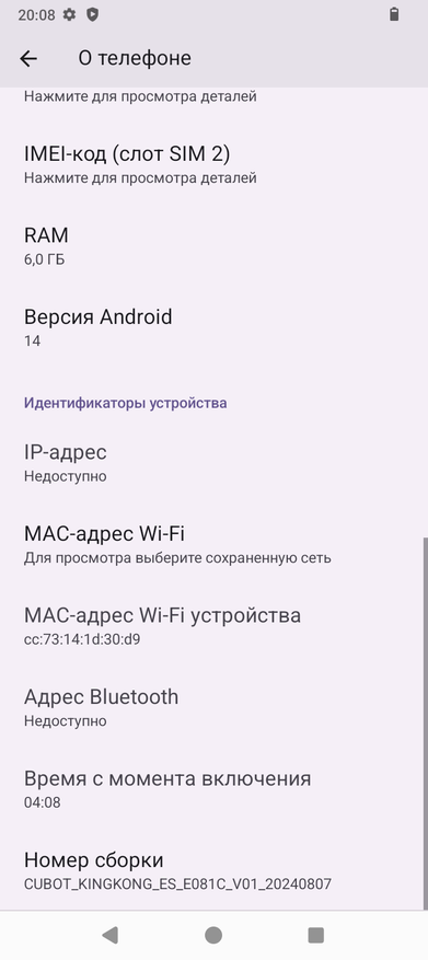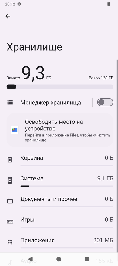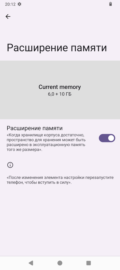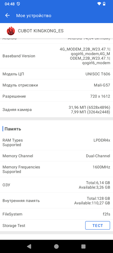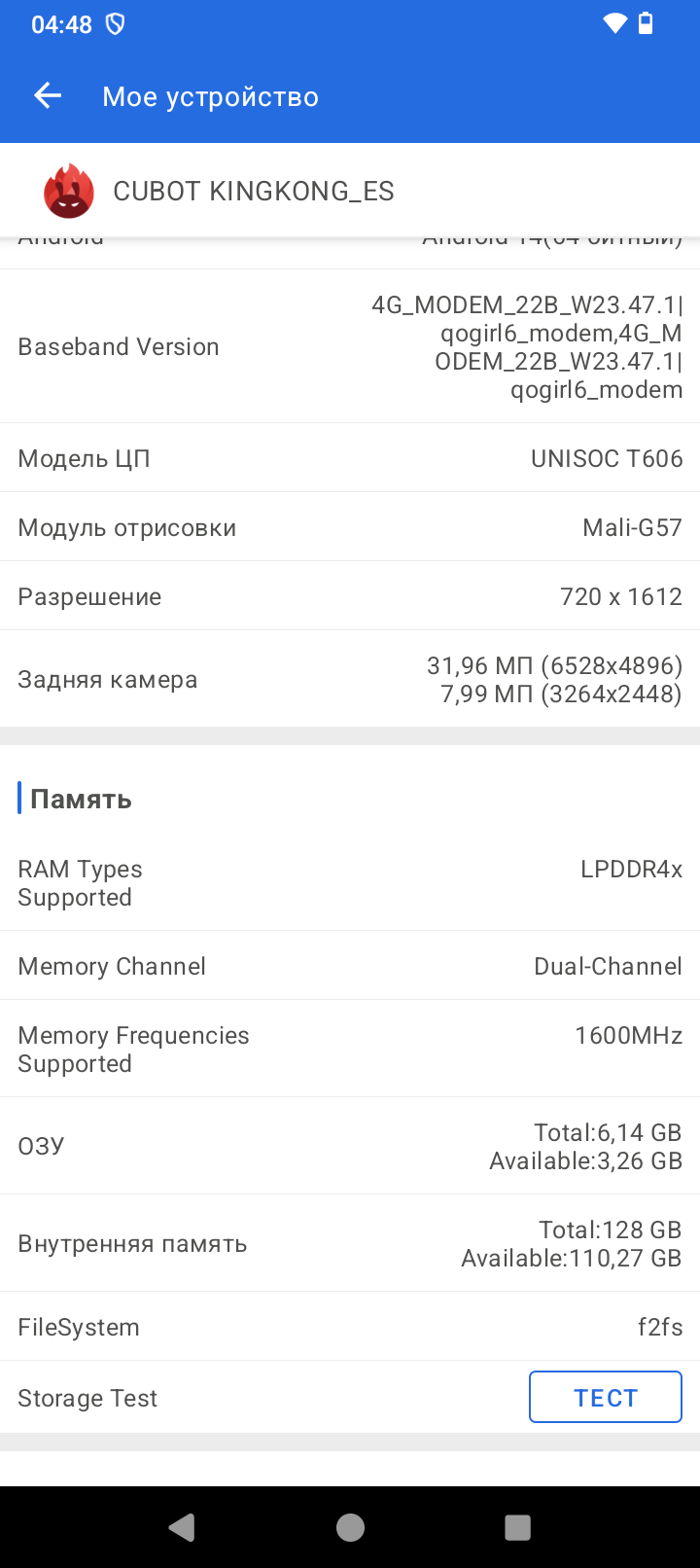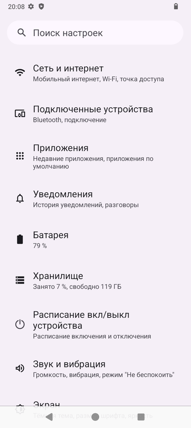 Аппарат базируется на операционной системе Android 14, его оболочка не имеет никакого лишнего софта, пункты меню локализованы процентов на 90. Управлять привычно при помощи быстрых инструментов в шторке, кнопок или жестов. Система занимает 9ГБ из 126ГБ ПЗУ. Оперативную память 6ГБ можно увеличить на 10ГБ при помощи опции расширения памяти из виртуальной области постоянной памяти.