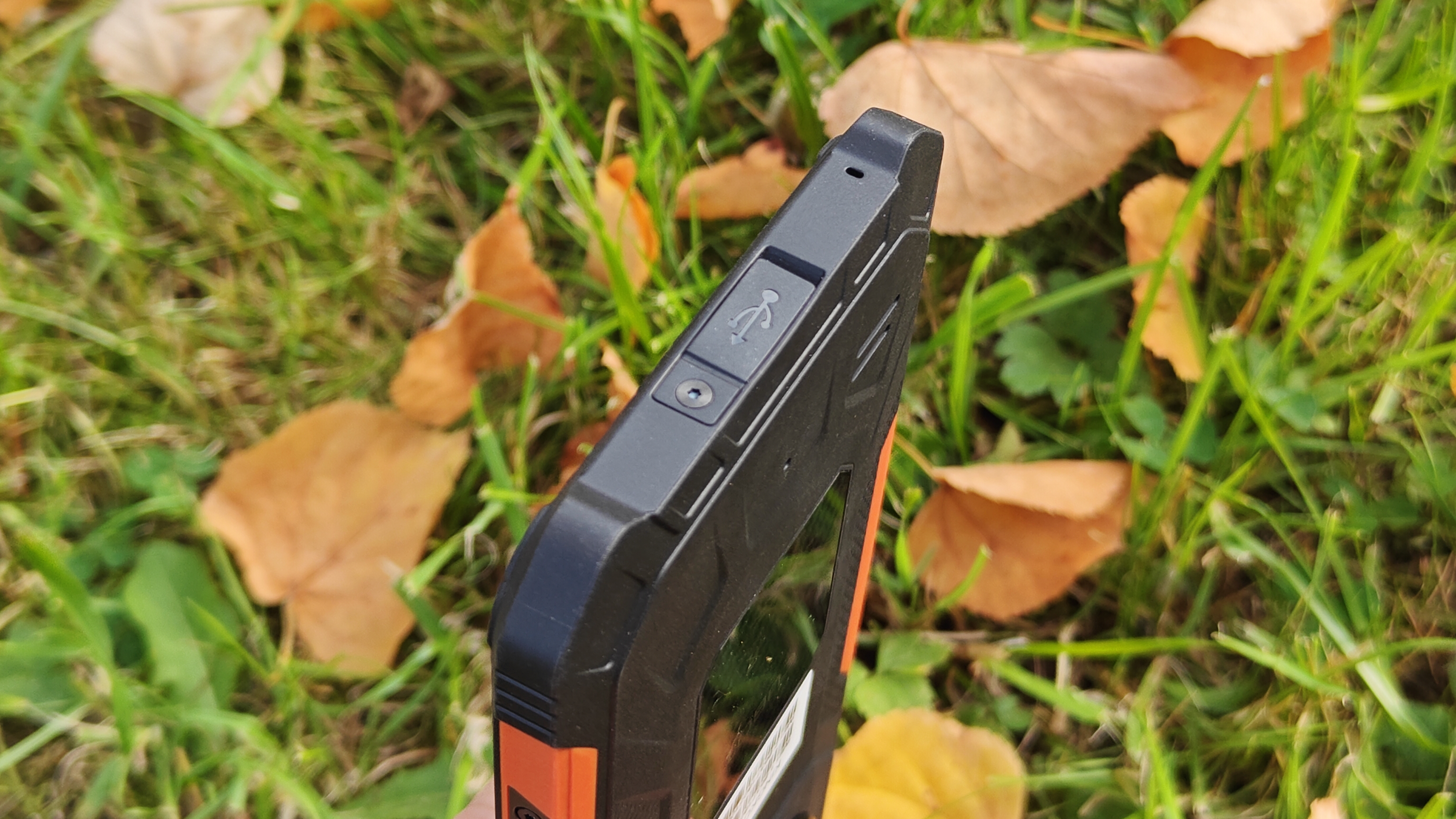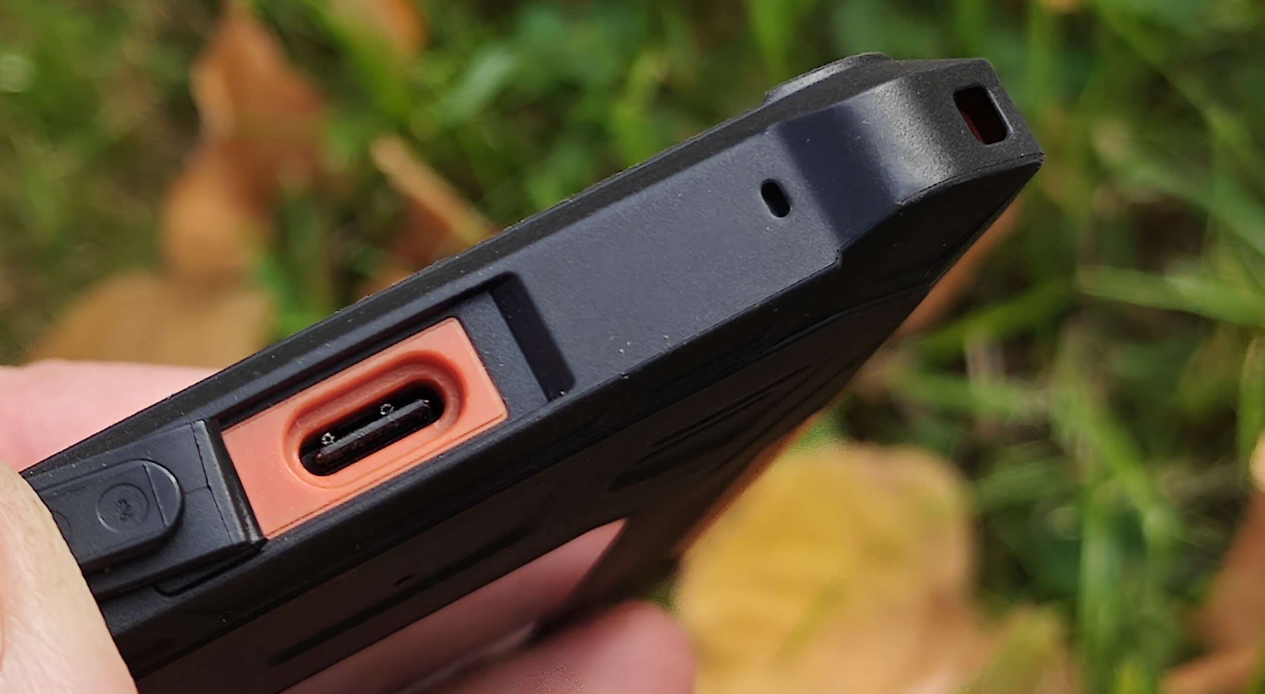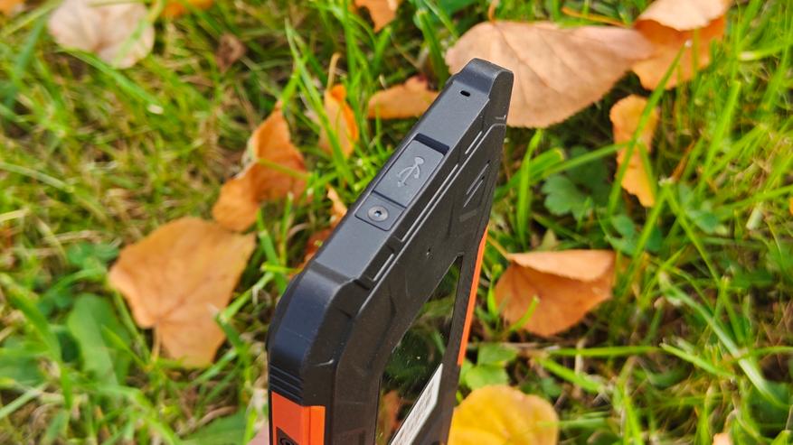 На нижнем торце аппарата еще одна резиновая заглушка, защищающая разъем Type-C для зарядки аккумулятора смартфона и отверстие защищённого от воды микрофона.